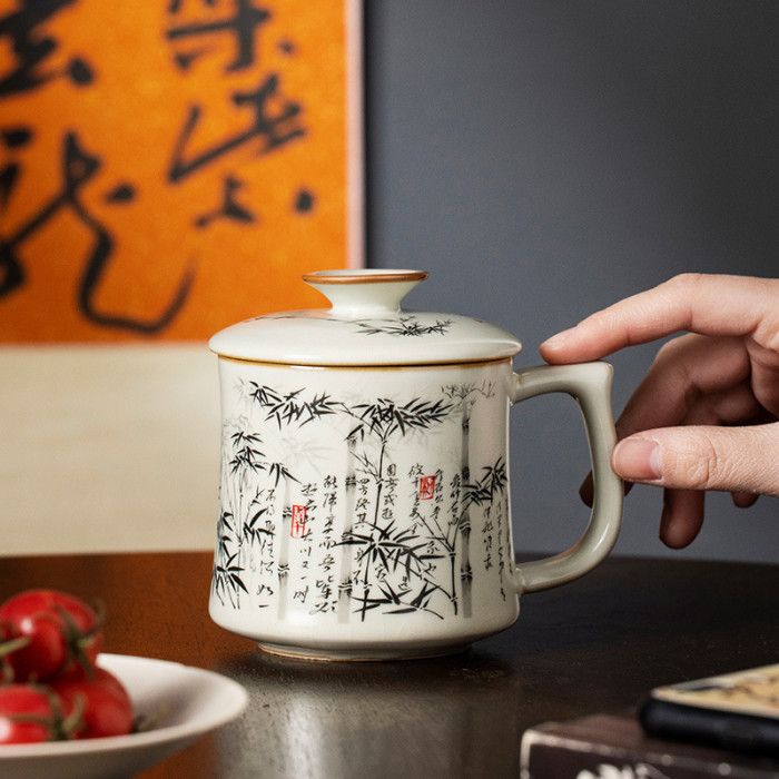 汝窰墨竹茶杯陶瓷帶蓋水杯馬克杯個人專用高檔辦公室喝茶杯子
