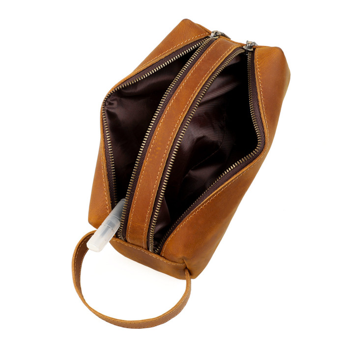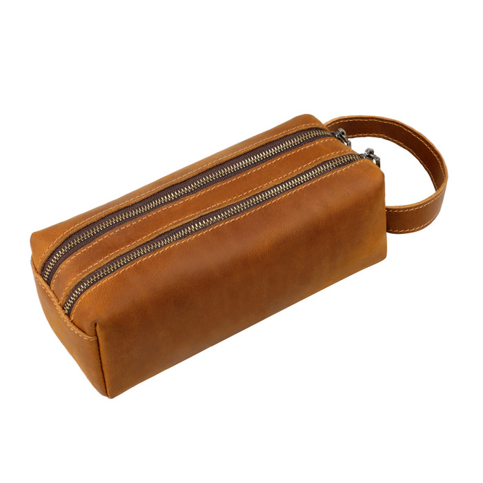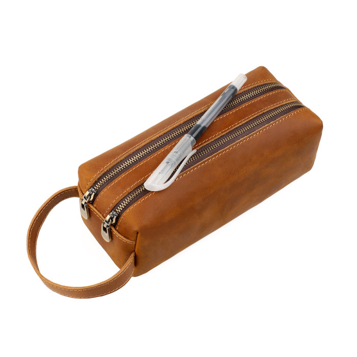 瘋馬皮雙拉鍊筆袋大容量手提文具手拿包鉛筆收納包真皮小包