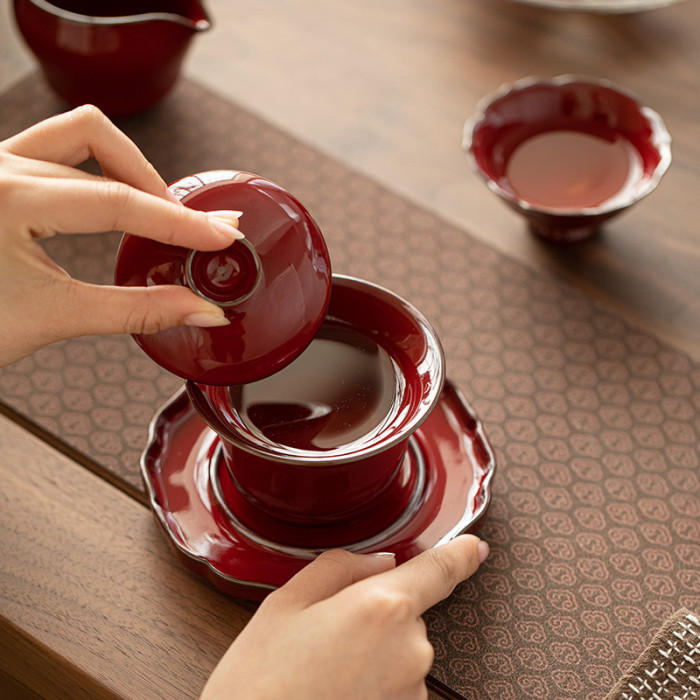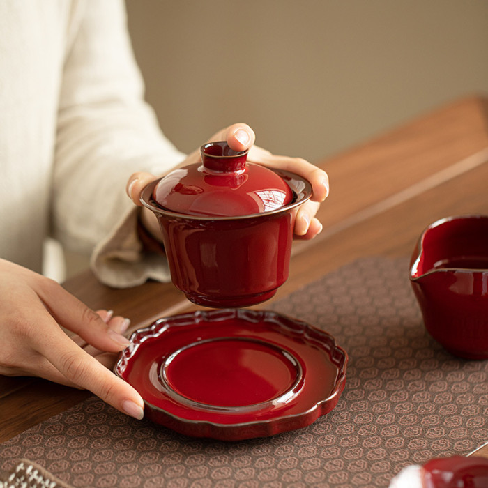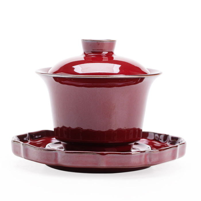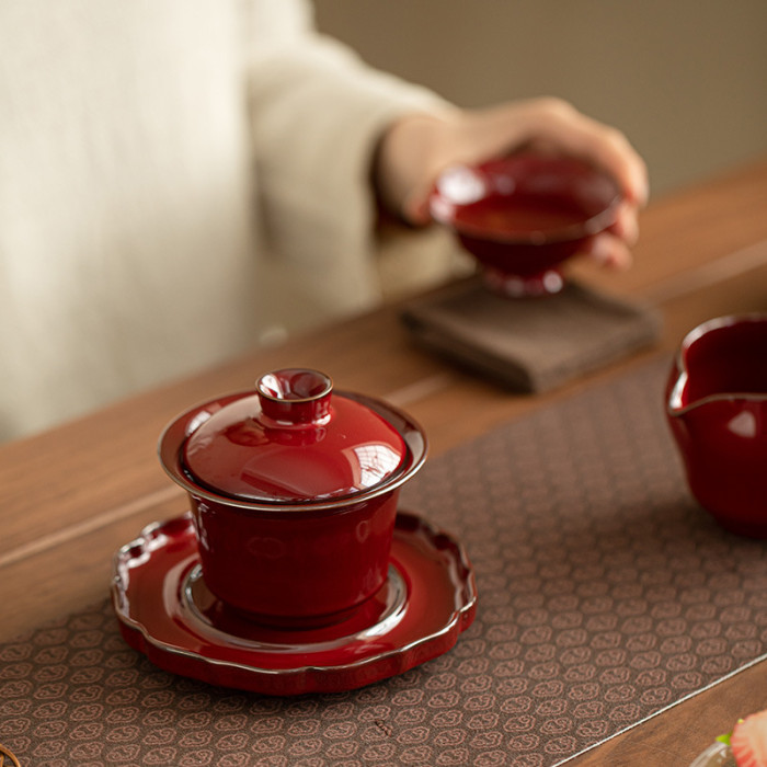 景德鎮窰變郎紅故宮紅三才蓋碗陶瓷茶具馬蹄蓋碗全套帶底托大