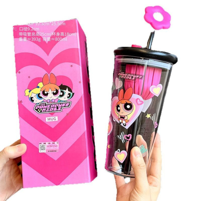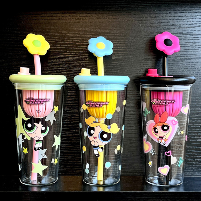 飛天小女警玻璃杯子女生高顔值2025新款吸管水杯泡茶分離夏日