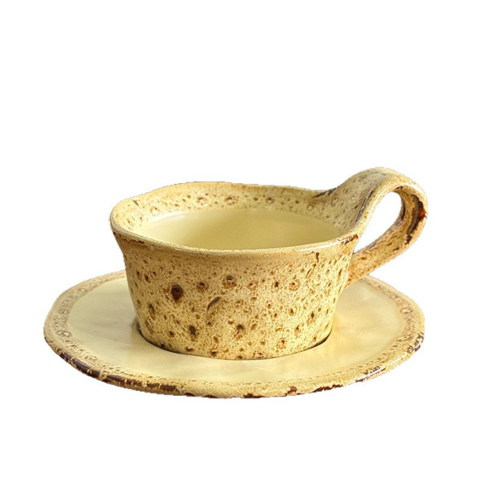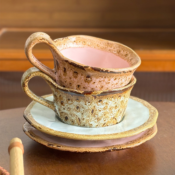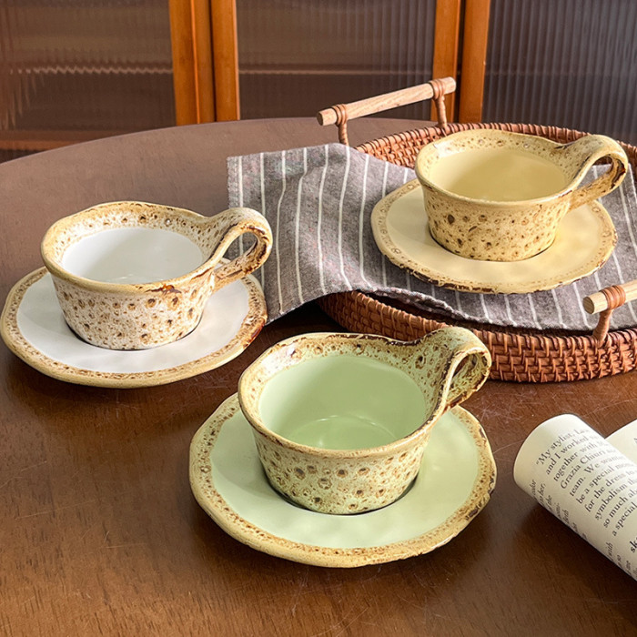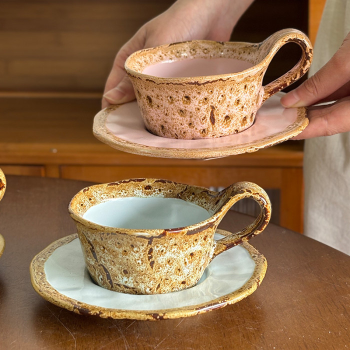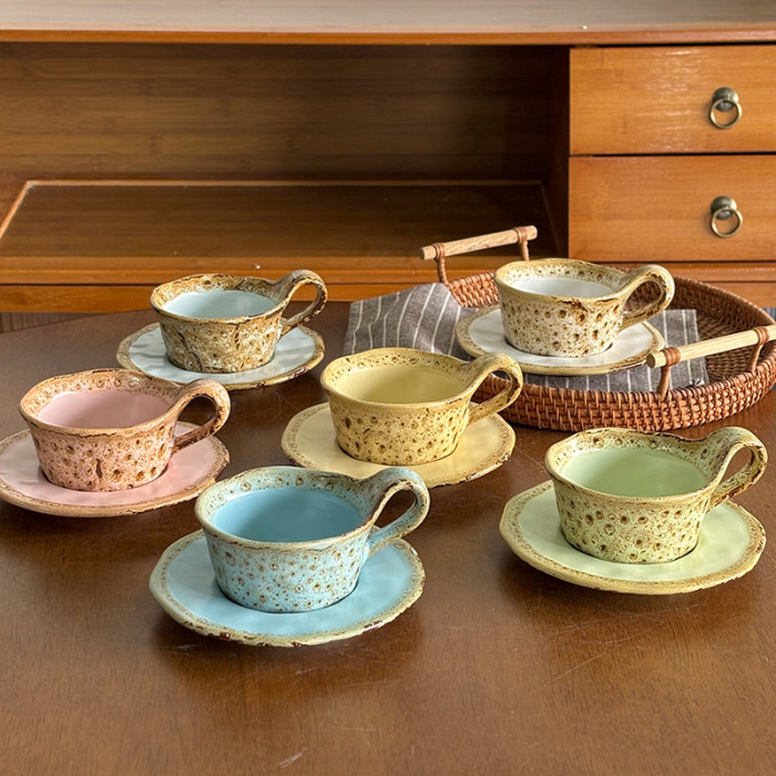 新款馬卡龍創意小衆粗陶咖啡杯碟高級感美式拿鐵杯復古窰變咖啡杯