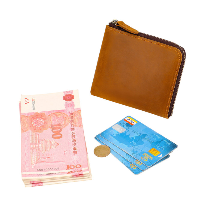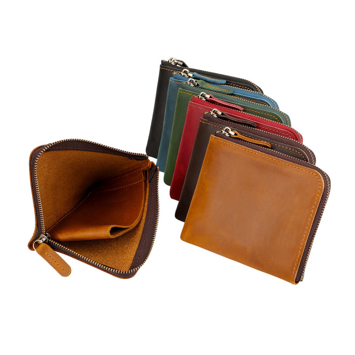 拉鍊短款錢包 瘋馬皮手工真皮卡包頭層牛皮男女士零錢包