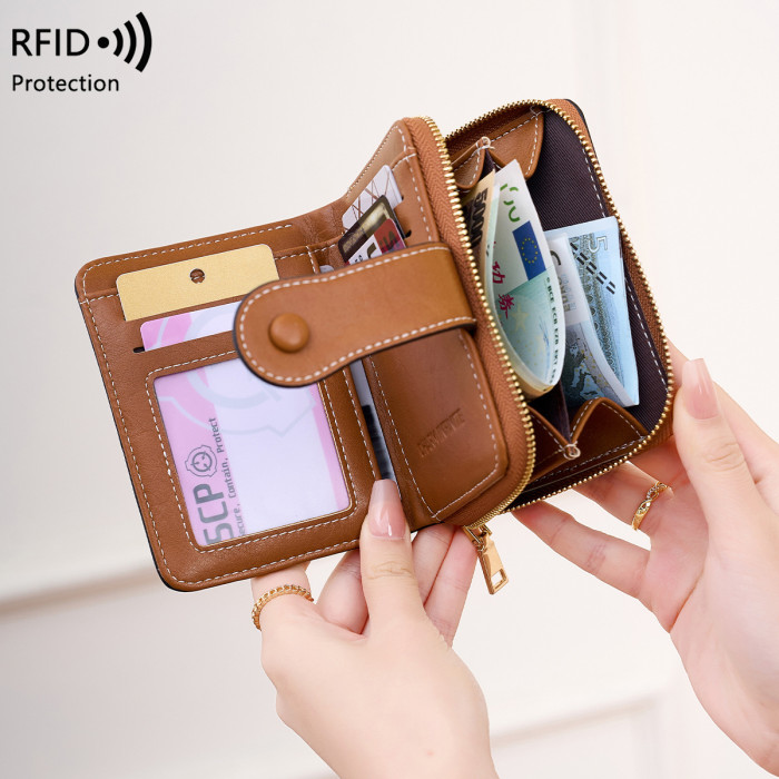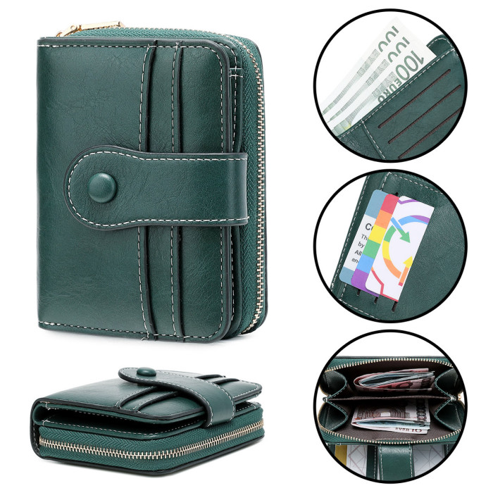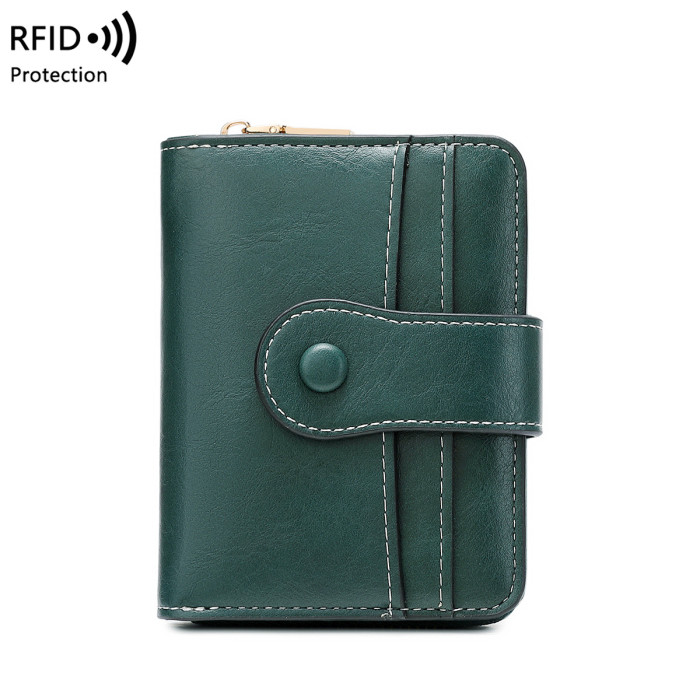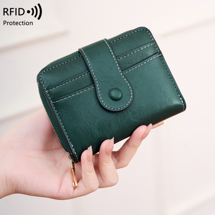 新款RFID女士錢包復古油蠟皮短錢包多功能可攜式拉鍊搭釦手拿包