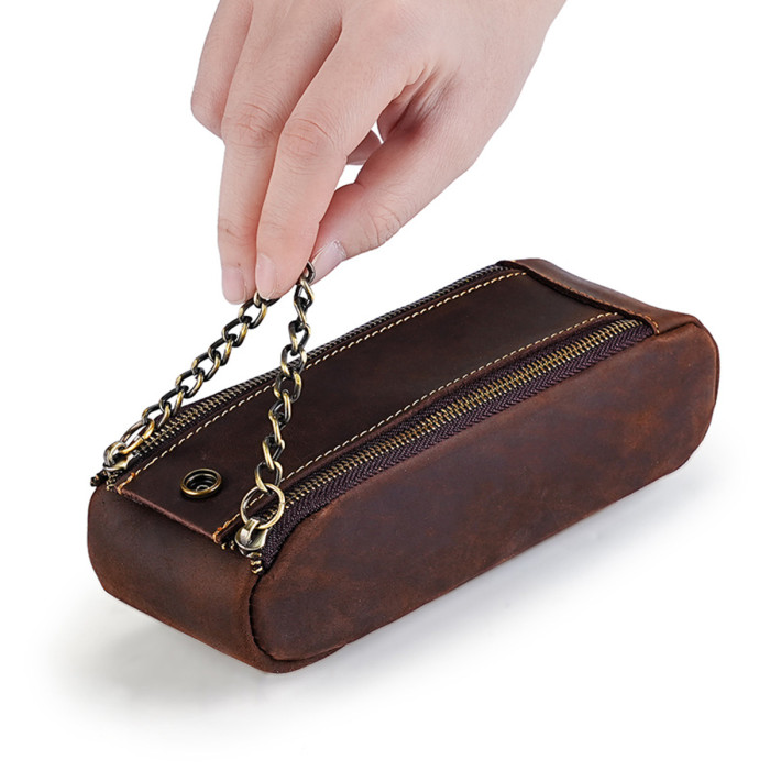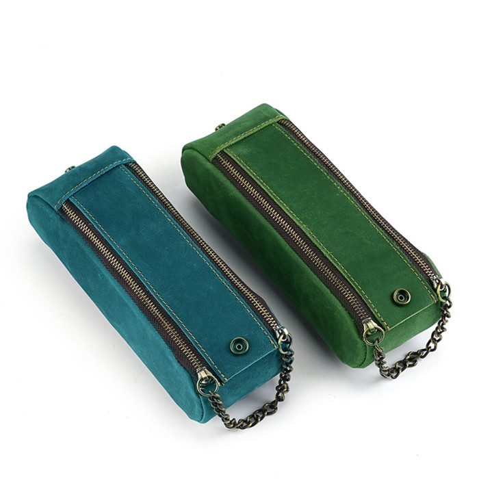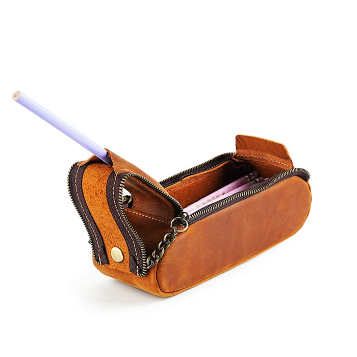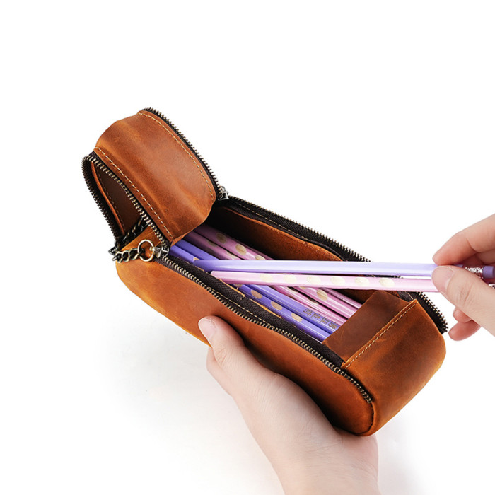 新款真皮筆袋瘋馬皮手提雙拉鍊畫筆皮套大容量復古鉛筆盒收納包