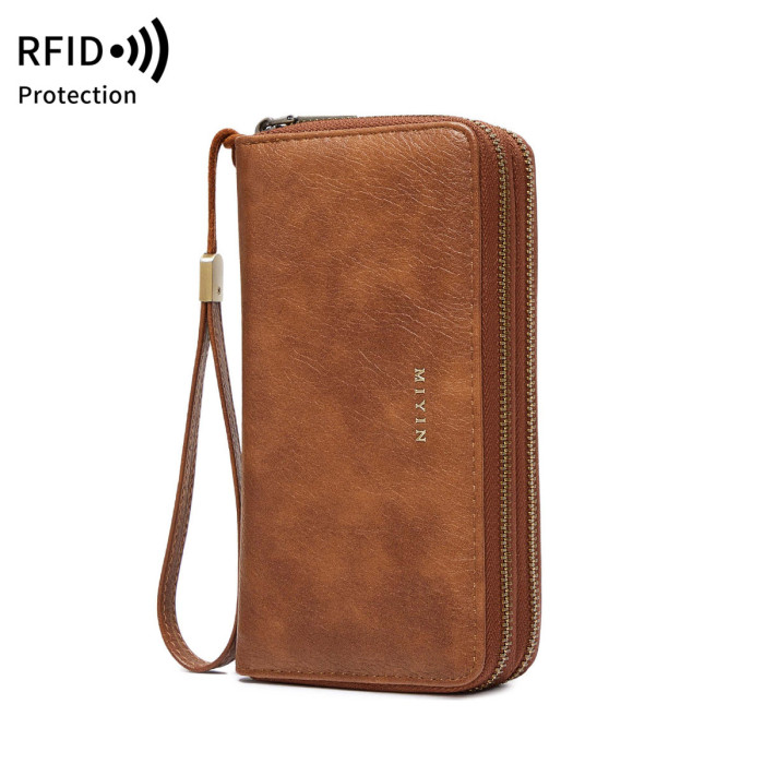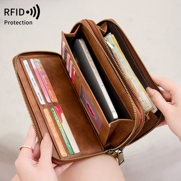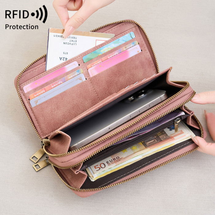 新款RFID防盜刷雙拉鍊錢包歐美復古女士手拿包簡約大容量錢夾