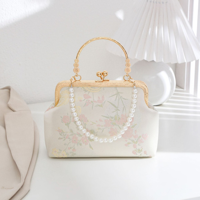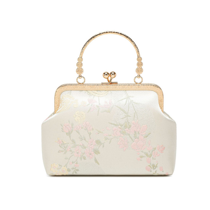 新中式絲綢國風刺綉漢服包夏天百搭斜背鏈條餃子包花卉圖案手拿包
