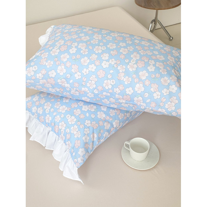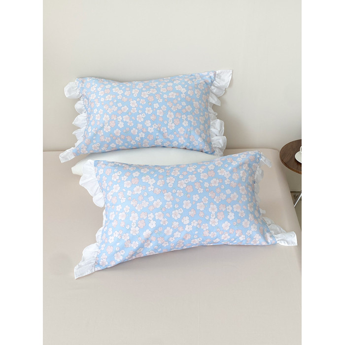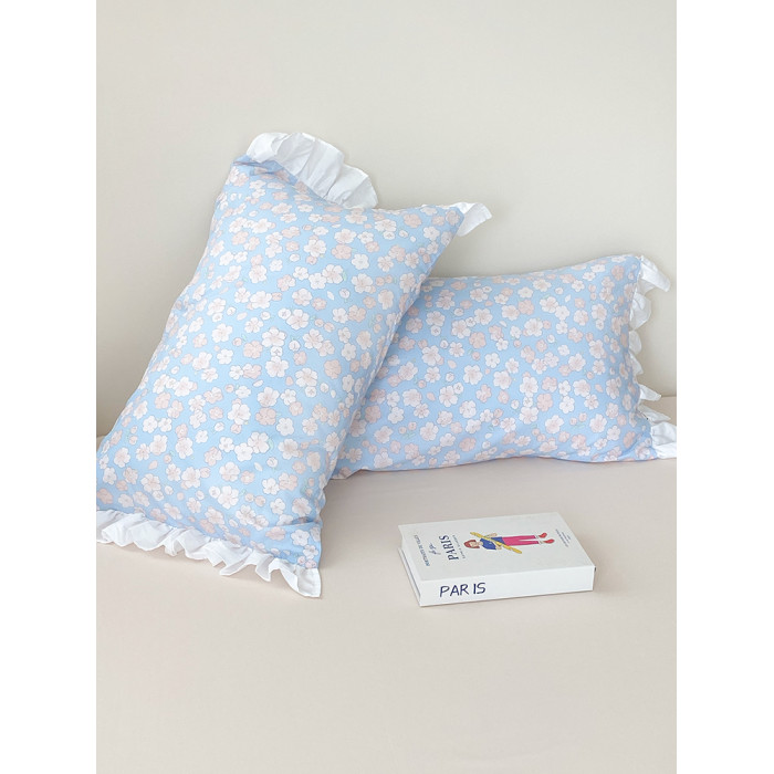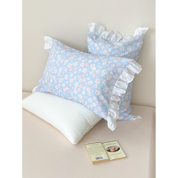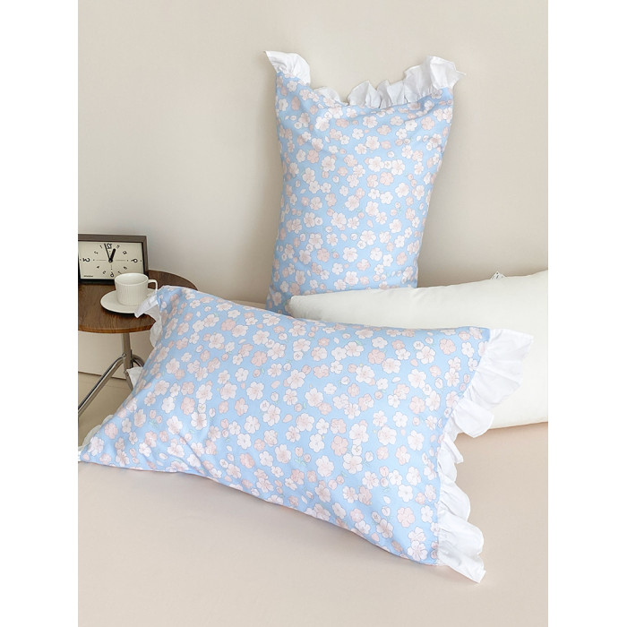 櫻花雨 日系浪漫全棉花邊枕套親膚純棉枕芯罩單衹48x74cm藍粉少女