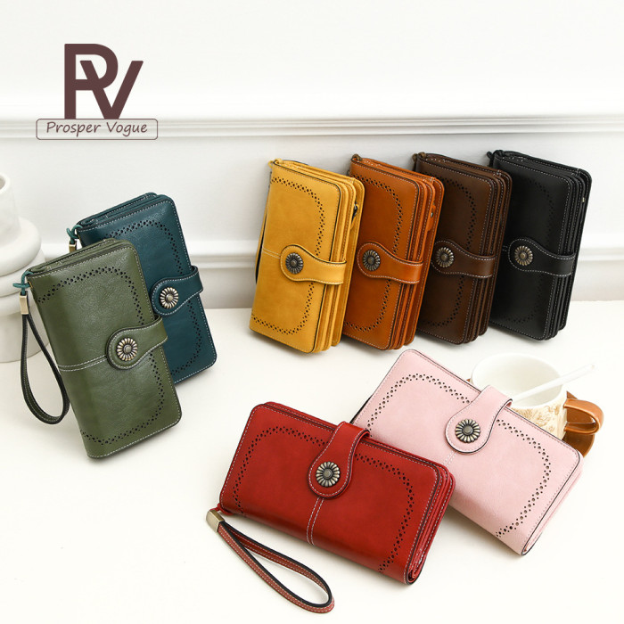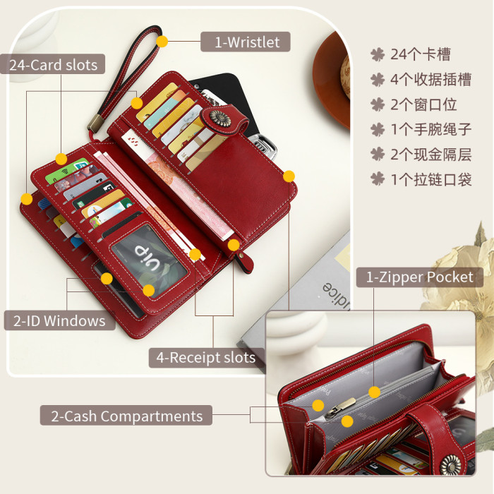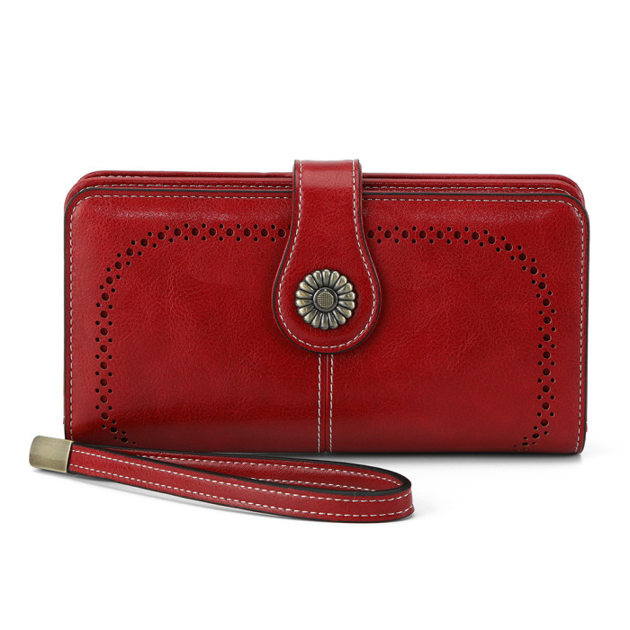 爆款RFID防磁錢包女歐美復古油蠟皮鏤空錢夾皮夾大容量手拿包