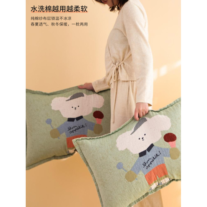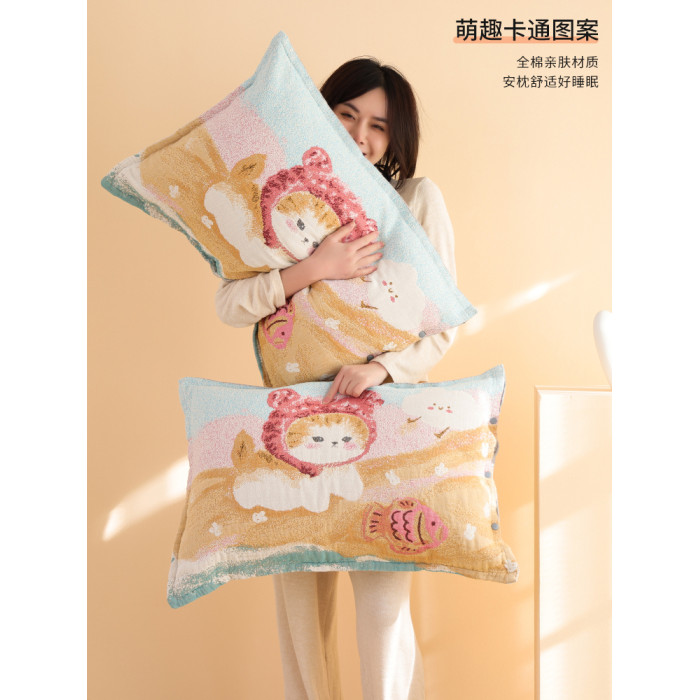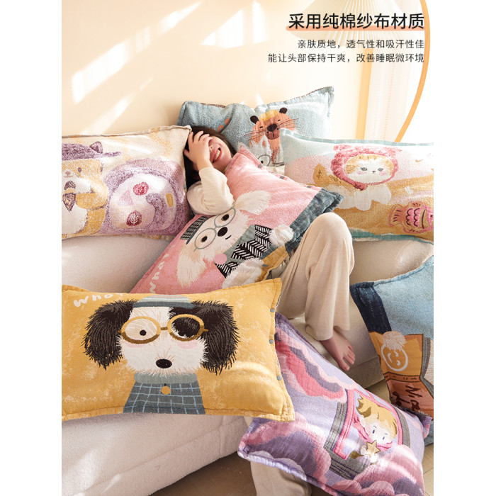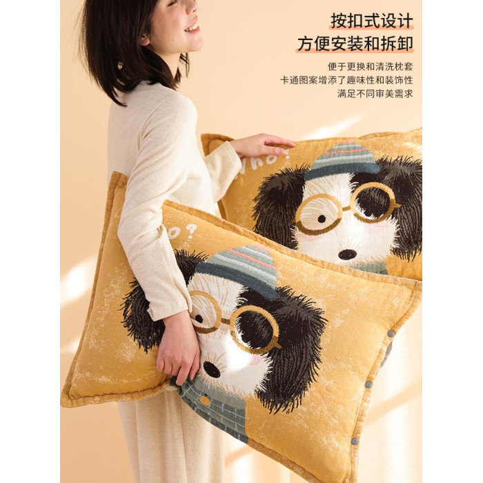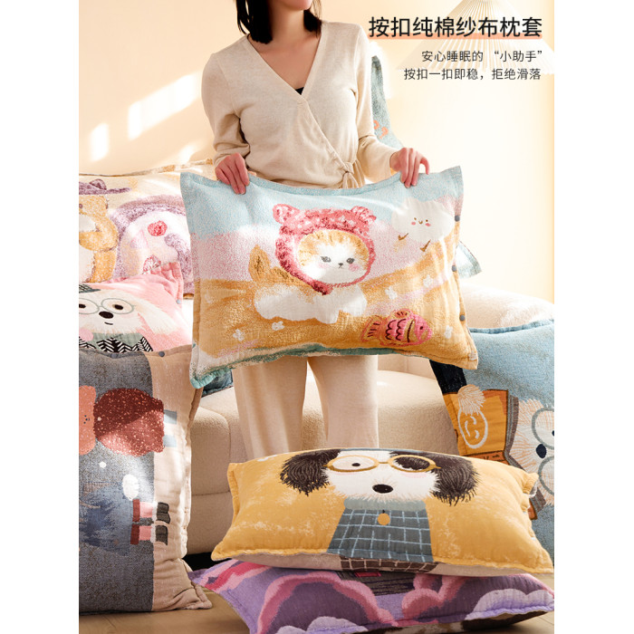 按釦純棉紗布枕套一對裝四季通用卡通不脫落吸汗防頭油全棉枕頭套