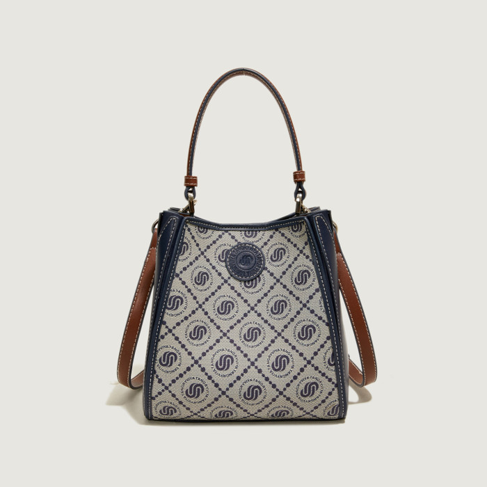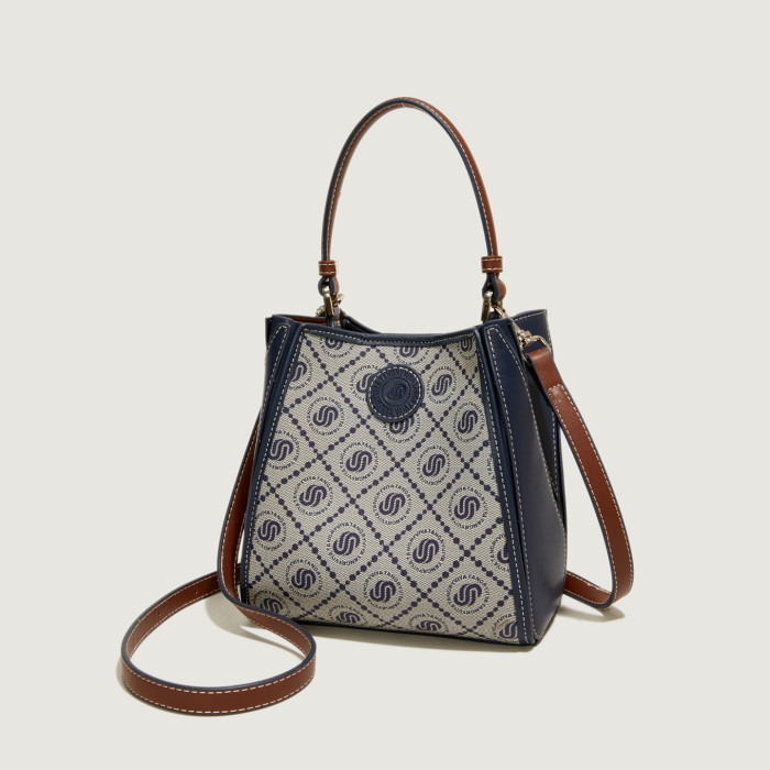 水桶包秋冬新款時尚老花桶包撞色印花斜後背包高級感通勤女士手拎包