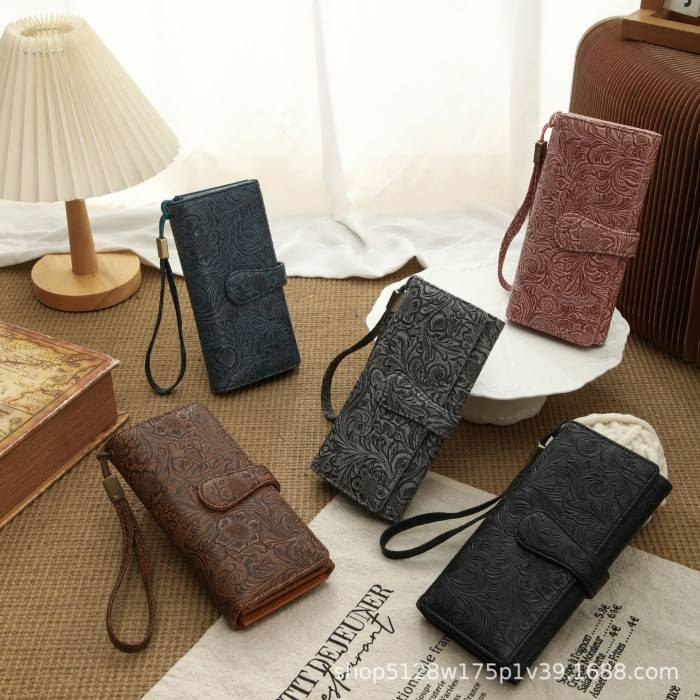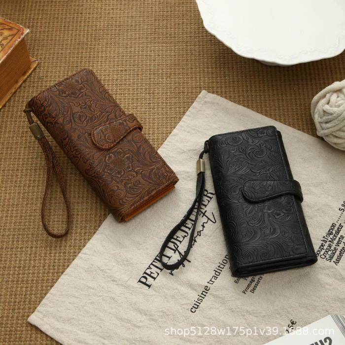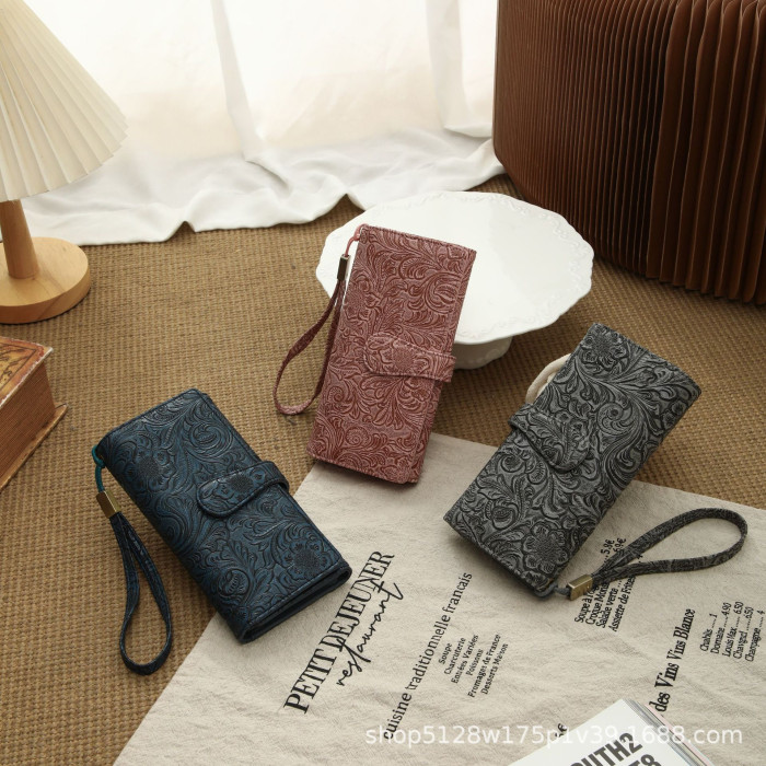 新款復古小衆錢包民族風3d立體壓花紋多卡位大容量長款手拿包