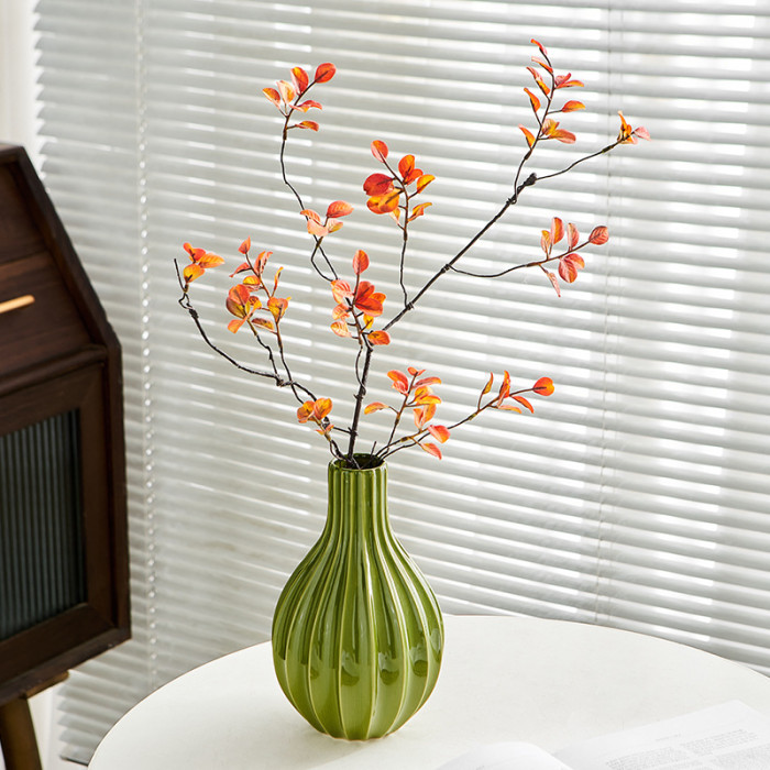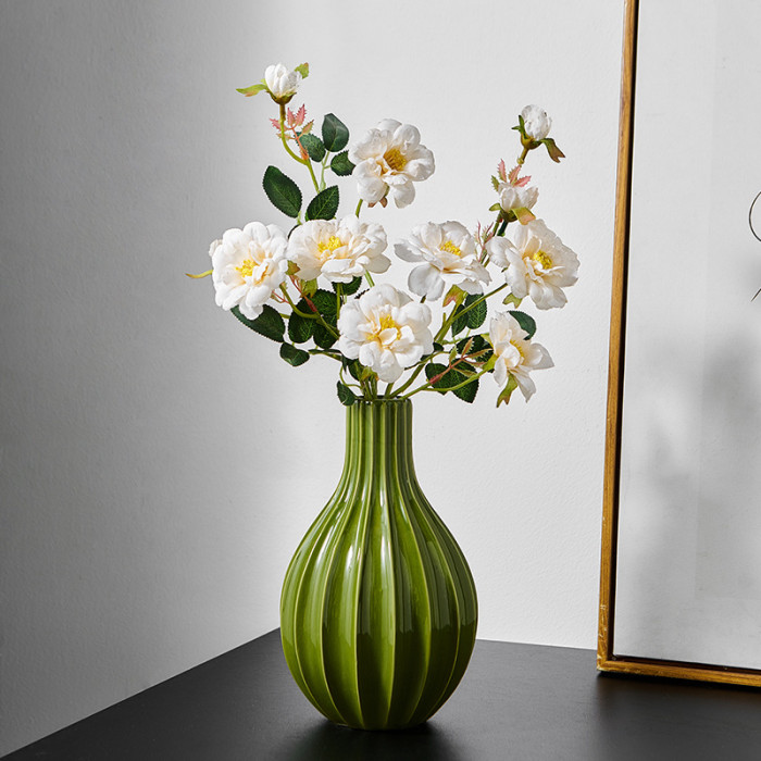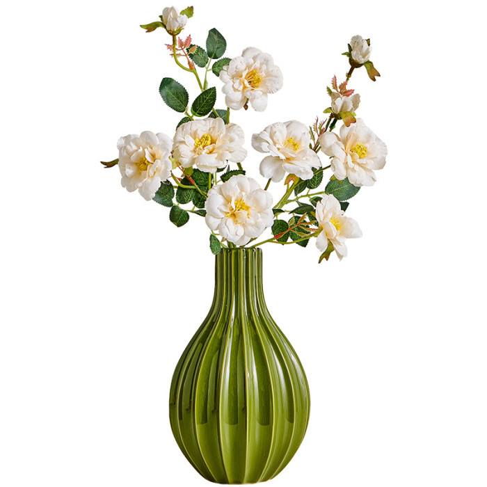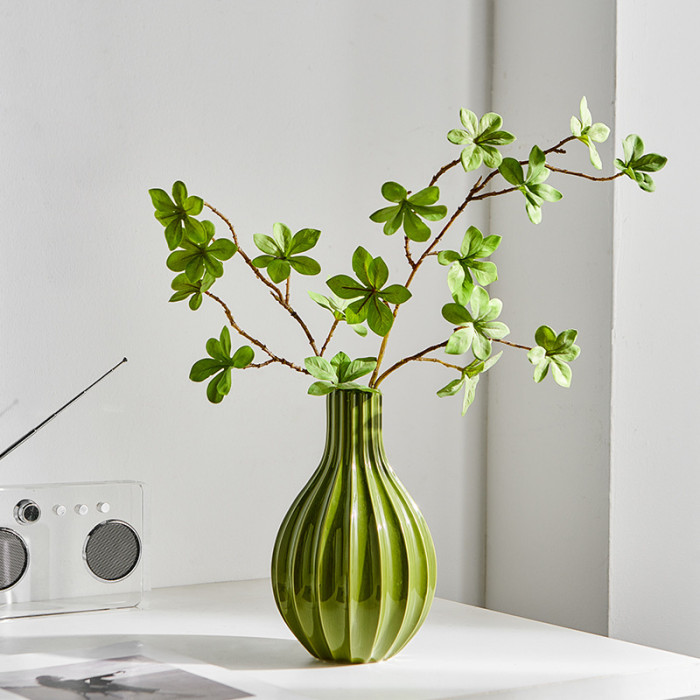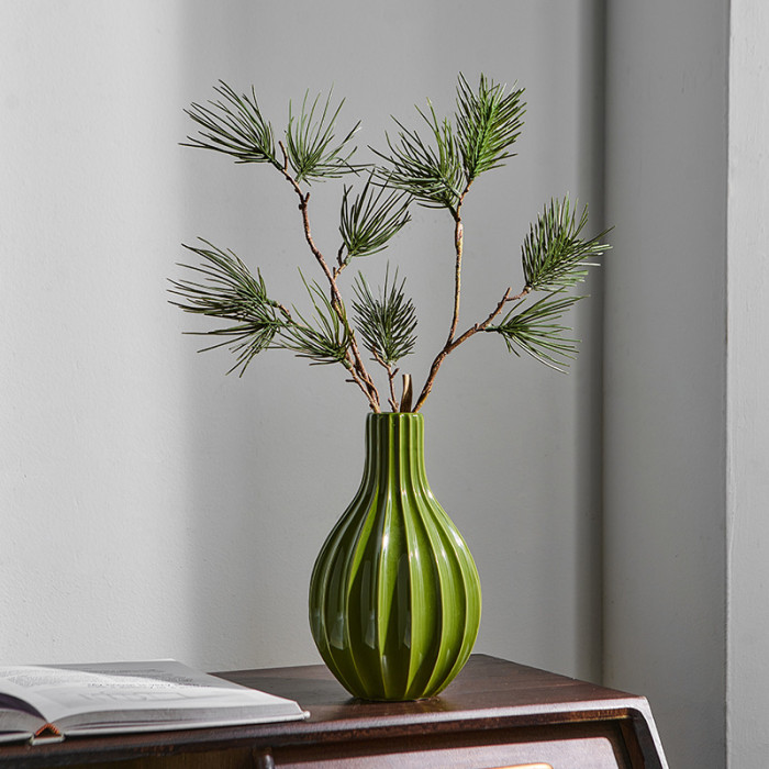 陶瓷綠色簡約條紋花瓶+倣真綠植