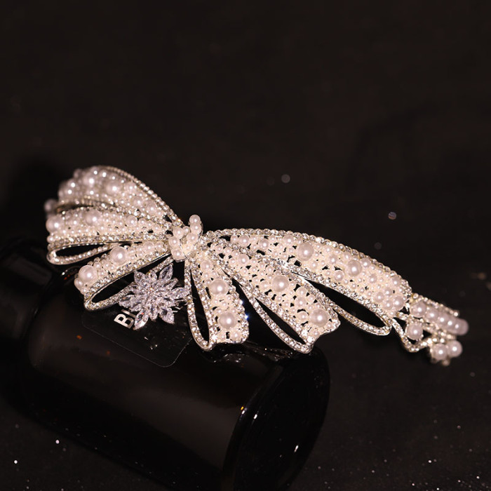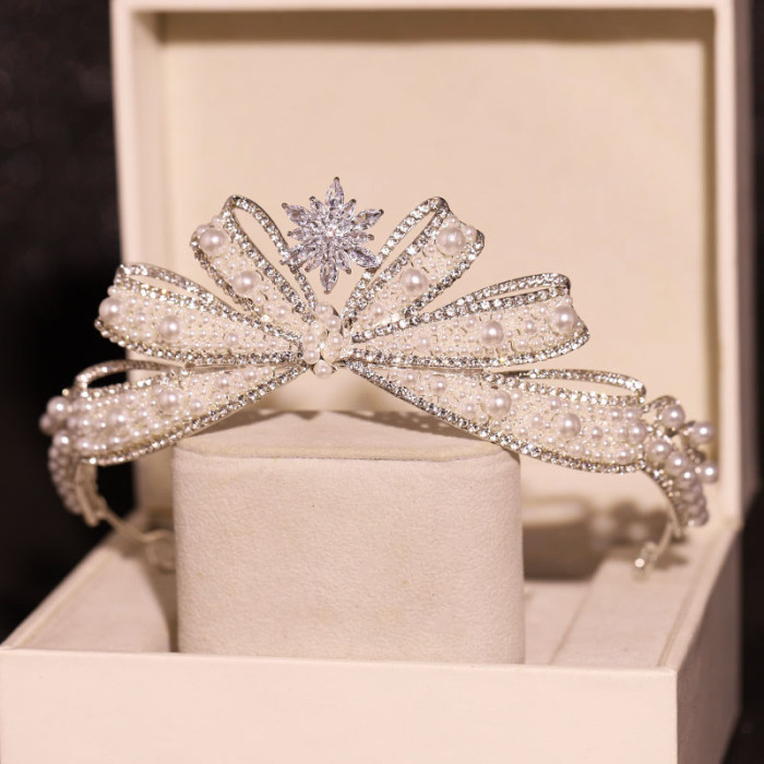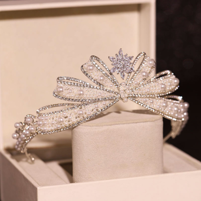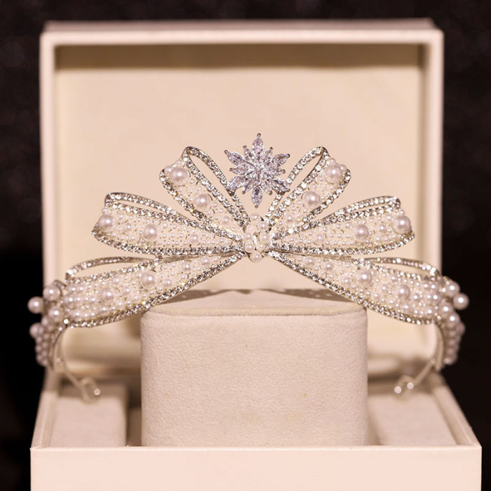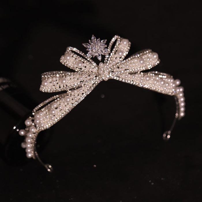 皇冠頭飾公主生日蝴蝶結造型王冠大氣鋯石珍珠王冠兒童主持人2025