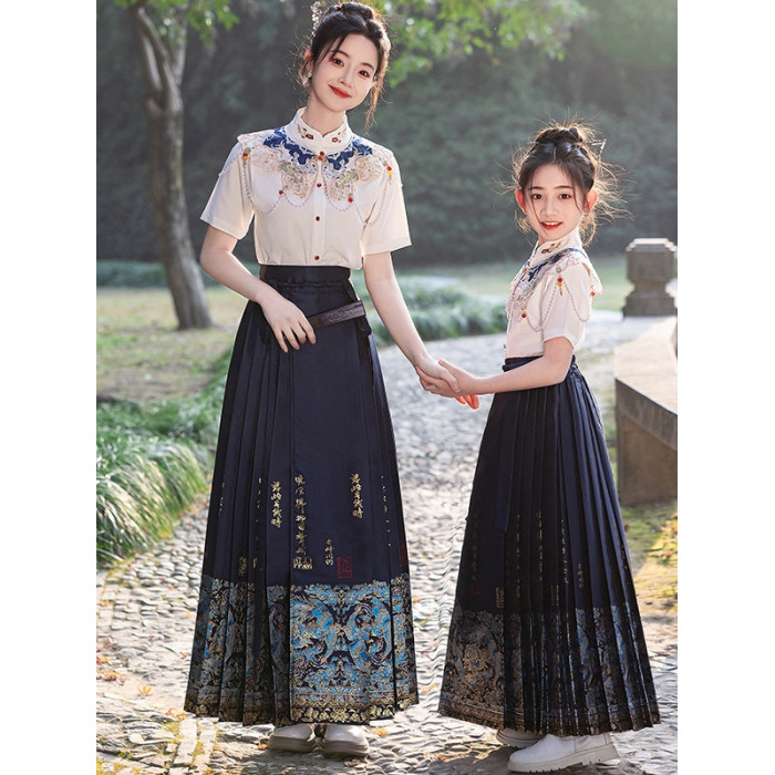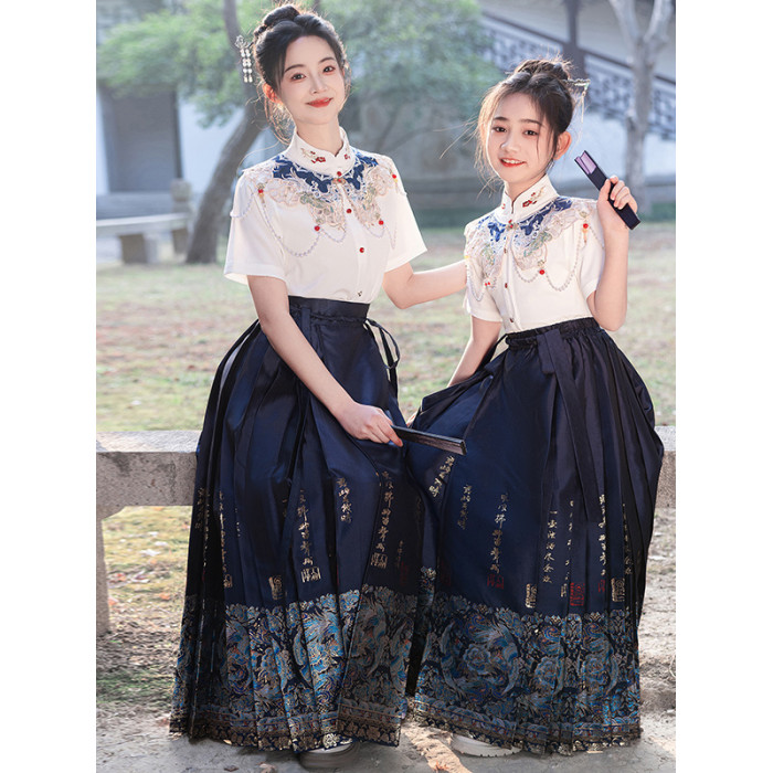 綉花襯衫短袖+鳳凰馬面裙藍色