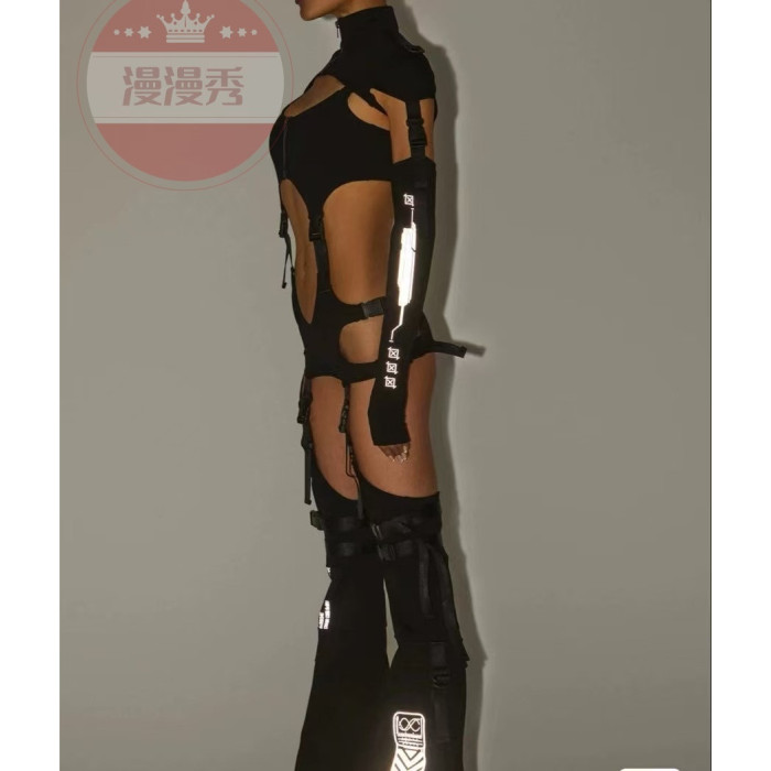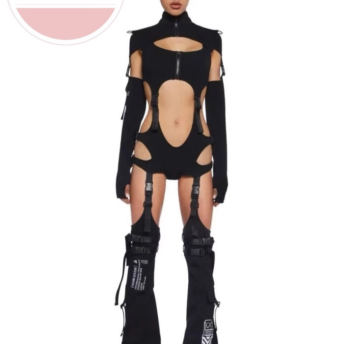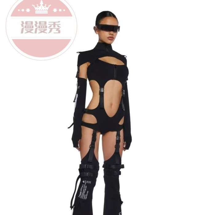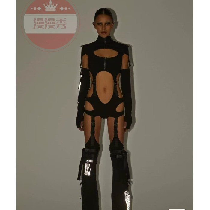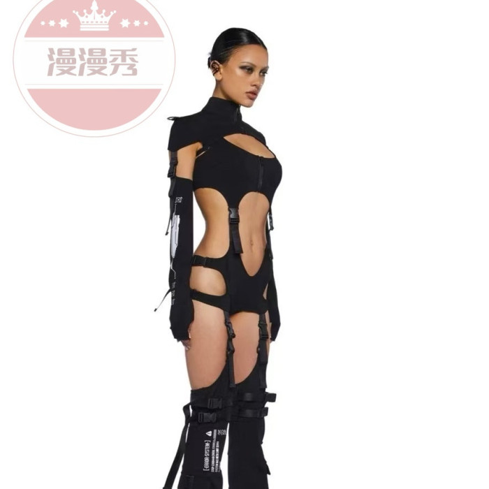 歐美性感鏤空書包釦露腰連體衣緊身鏤空辣妹裝龐克搖滾舞台演出服