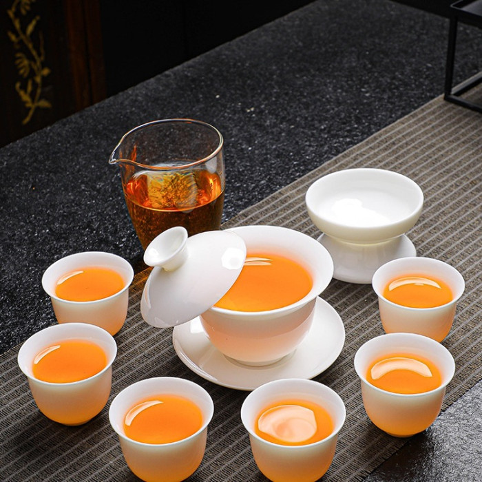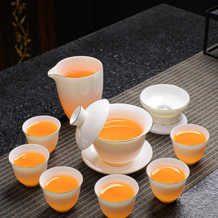 羊脂玉 提金邊福茶洗茶磐 14頭套裝