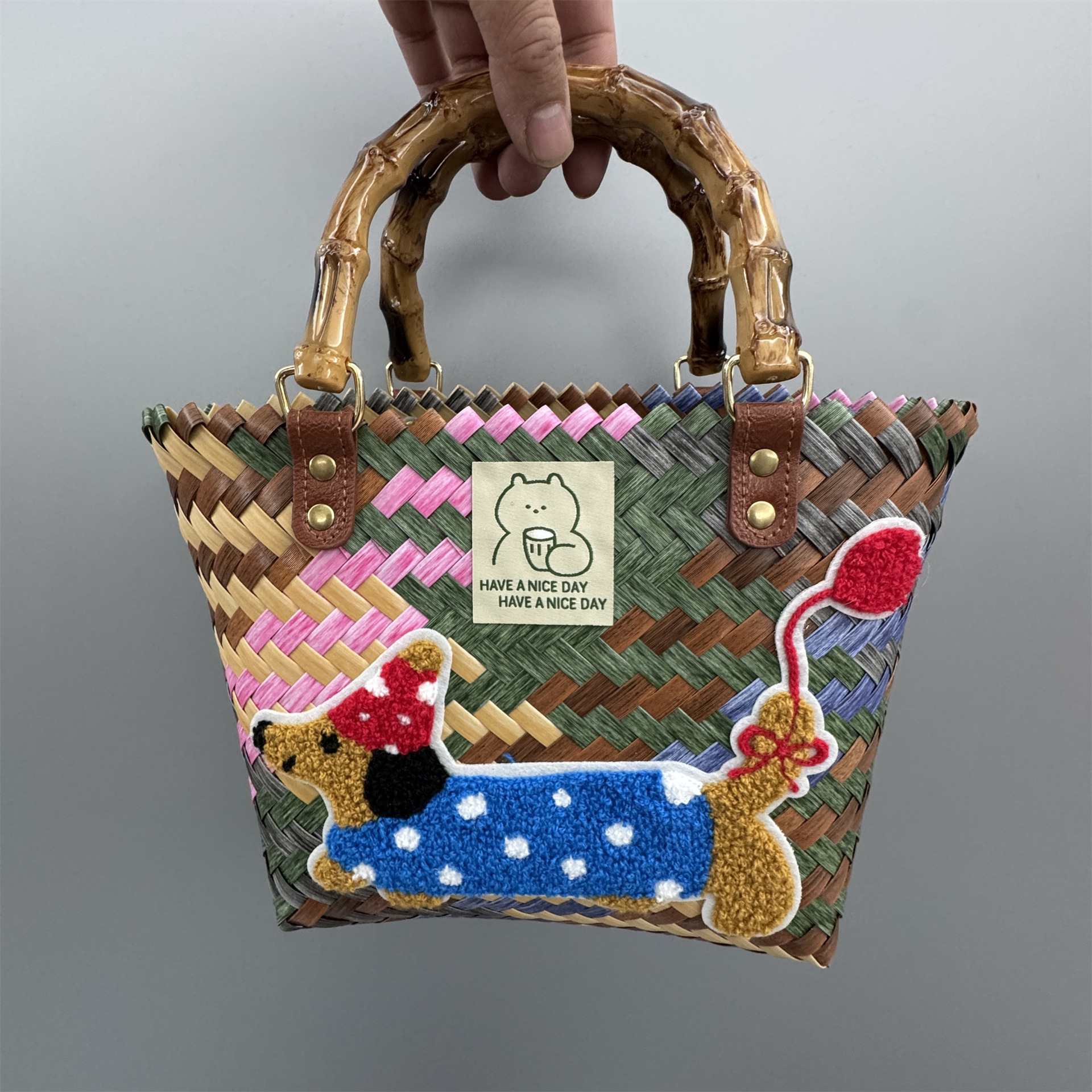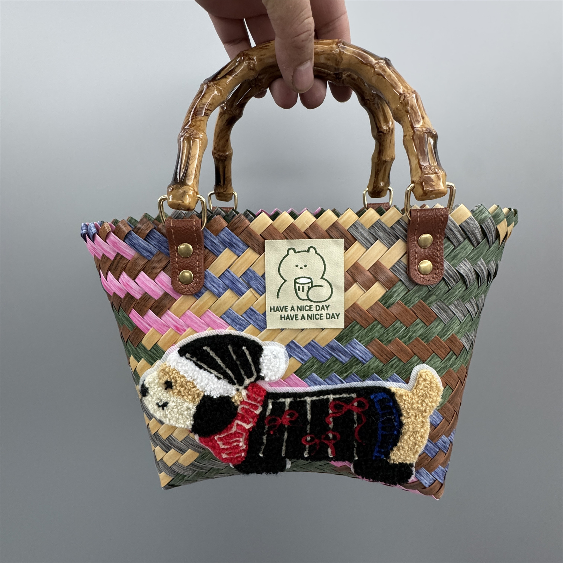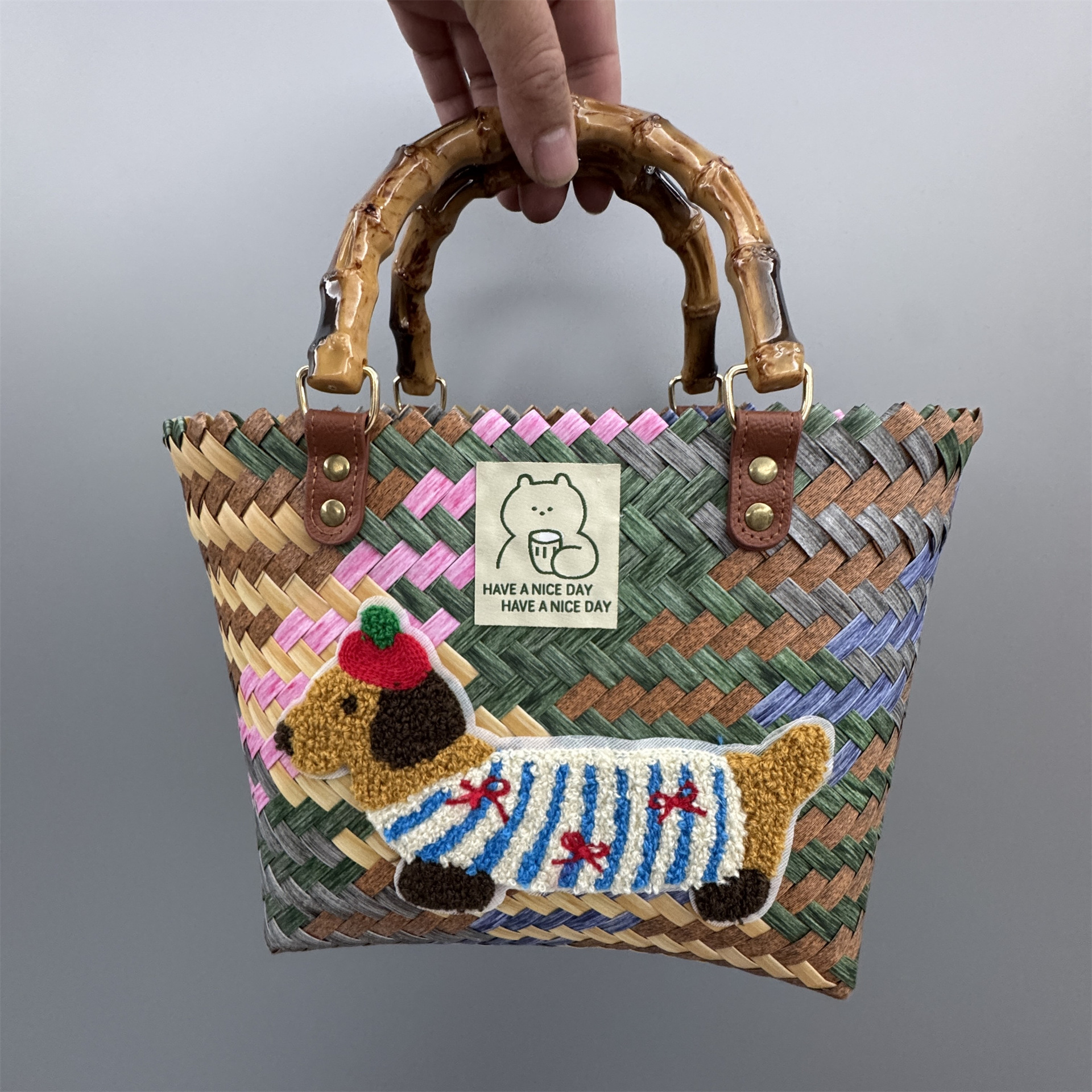 新款復古條紋臘腸狗多色編織托特包通勤女士手提包編織包包