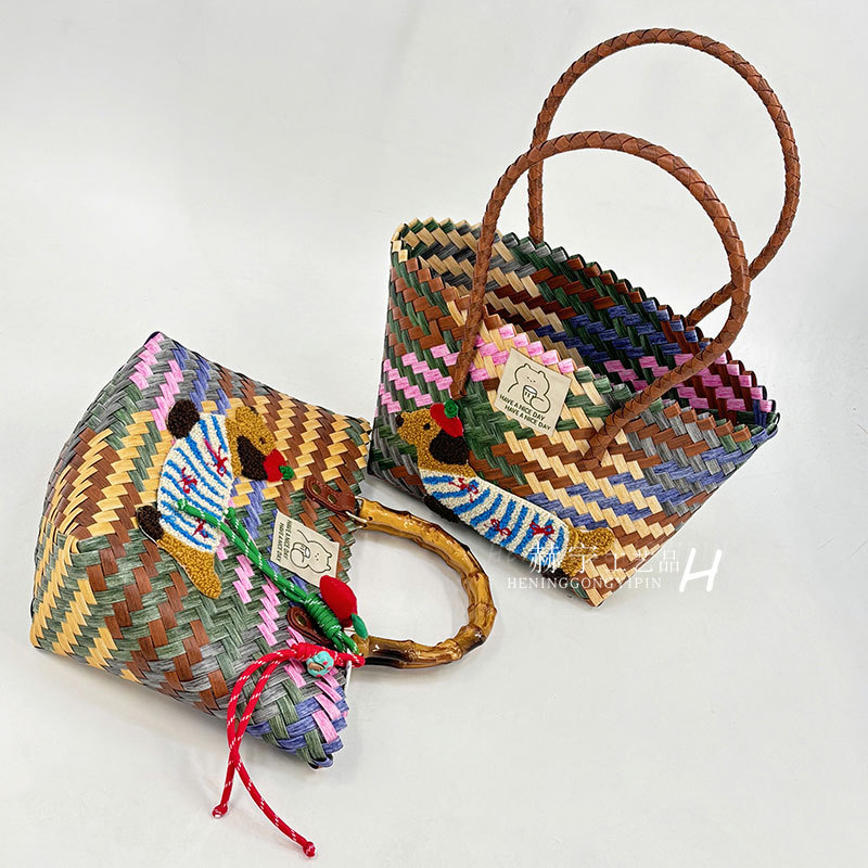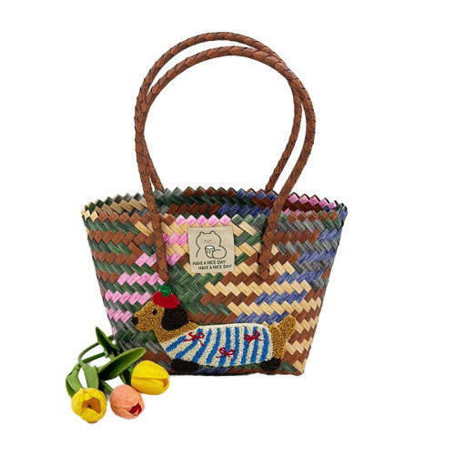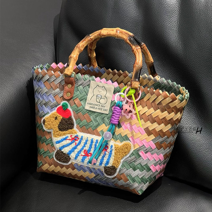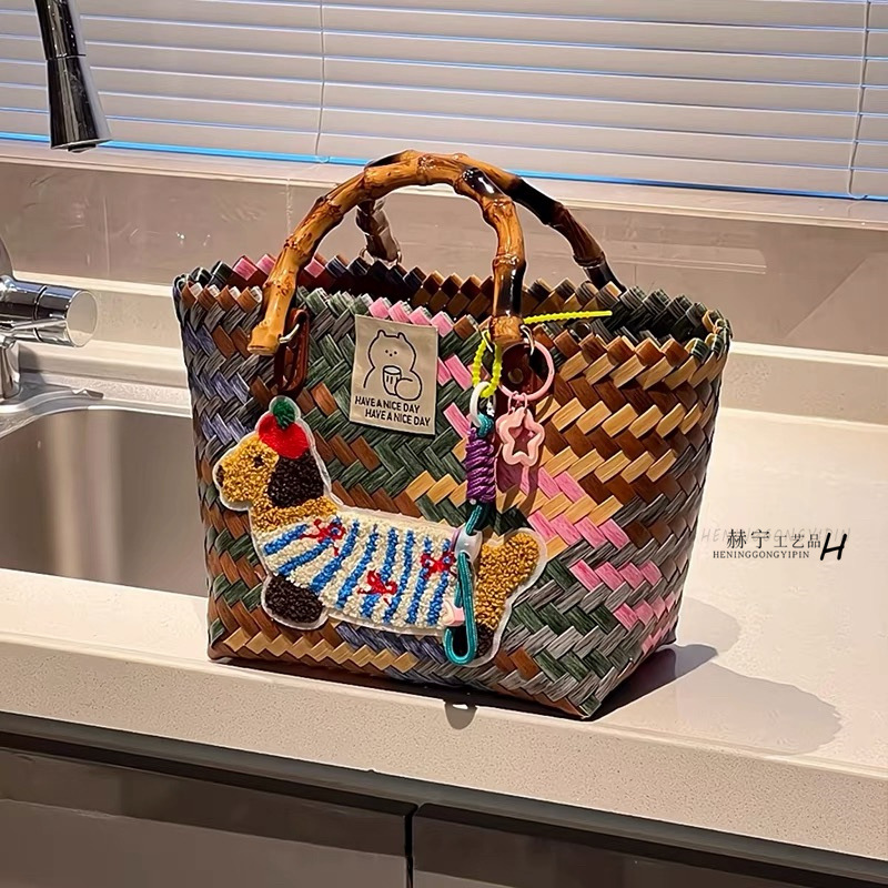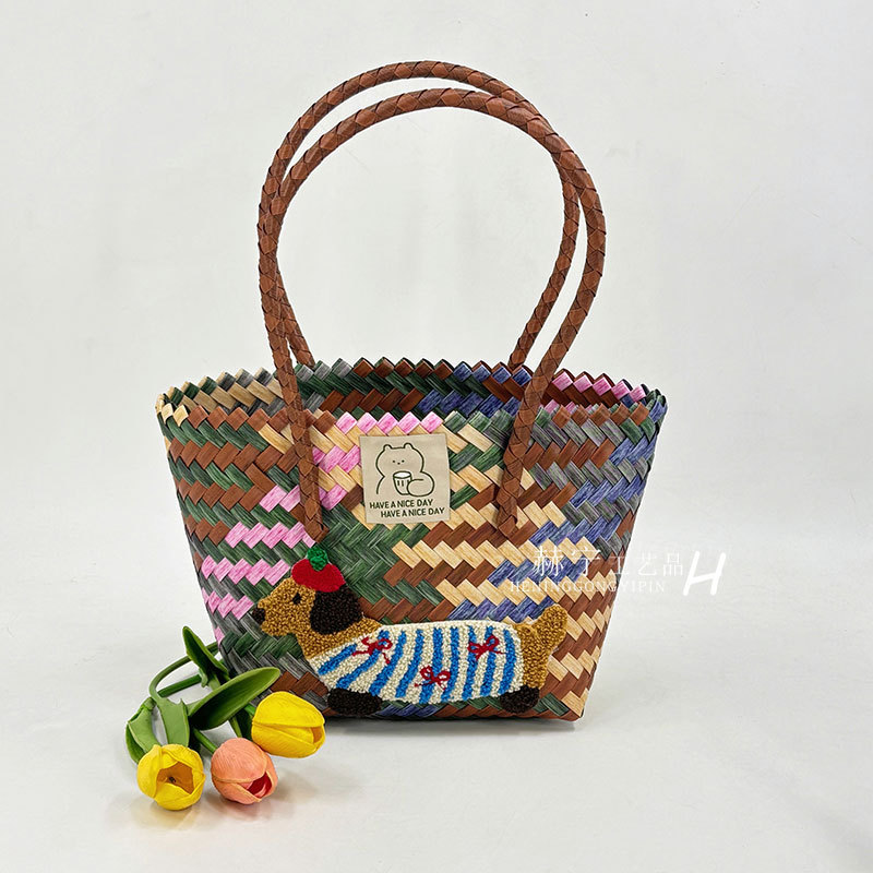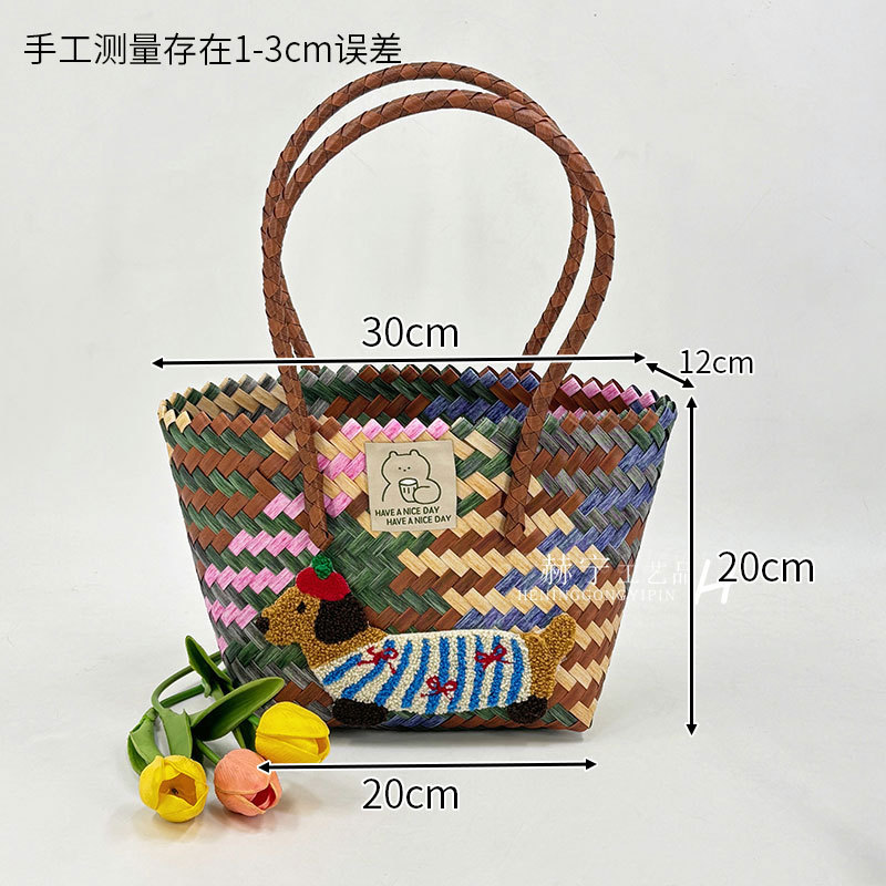 復古條紋臘腸狗狗編織包手提包尼龍繩吊墜托特包手拎女包沙灘包