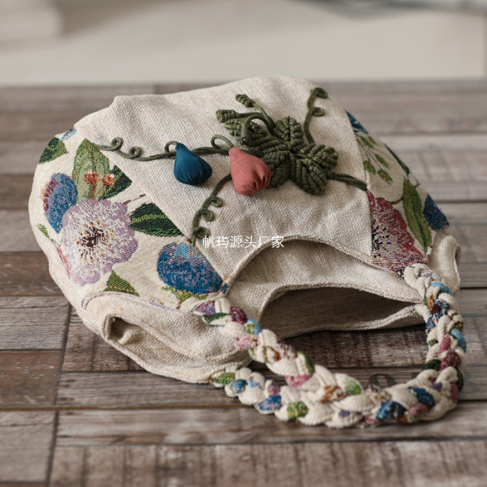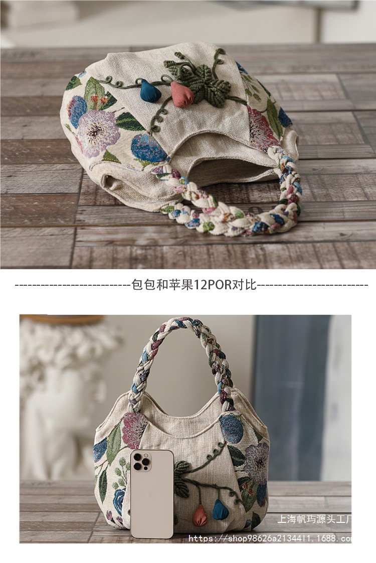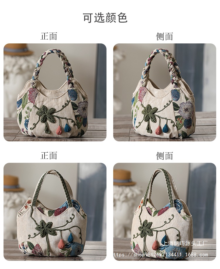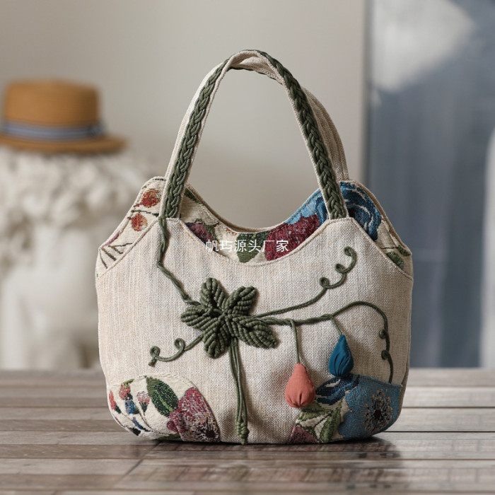 民族風手工編織帆布包多隔層手提包休閒風多夾層手拎袋拉鍊女布包