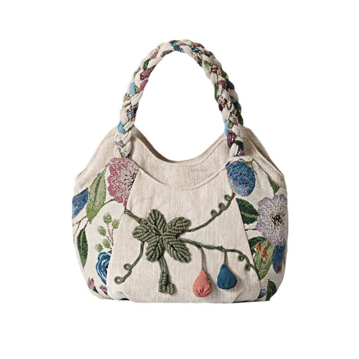 民族風手工編織帆布包多隔層手提包休閒風多夾層手拎袋拉鍊女布包