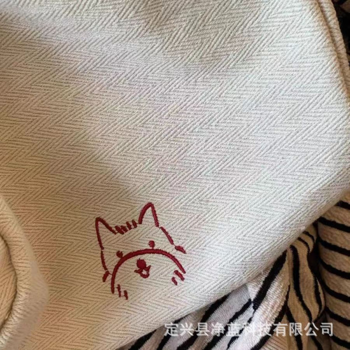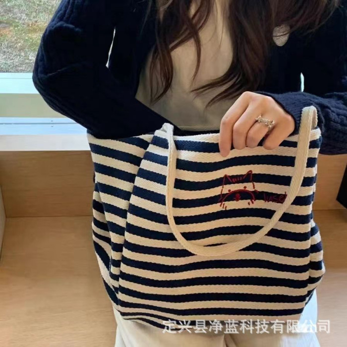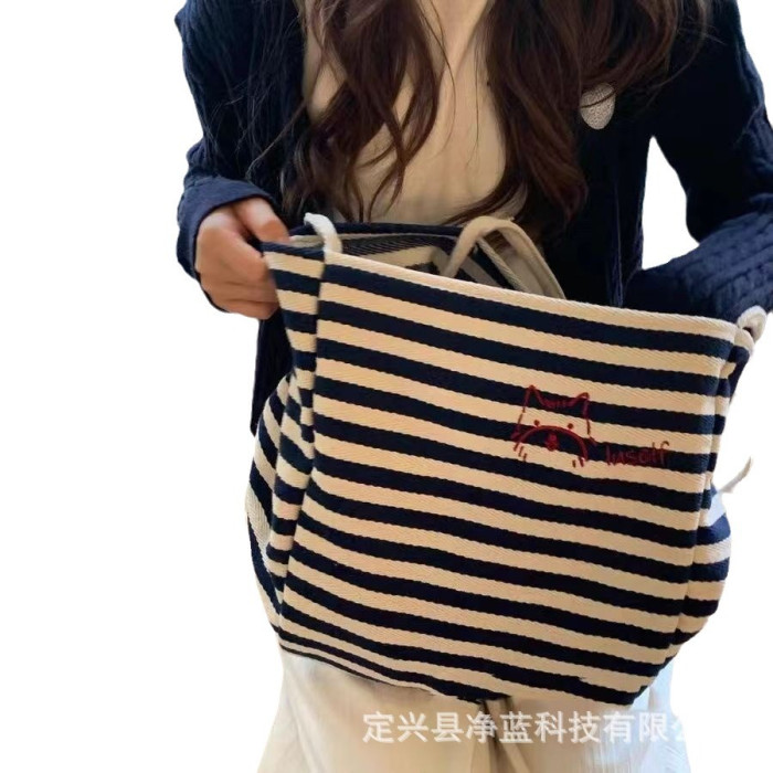 條紋帆布包“快樂小狗”小衆刺綉大容量慵懶風托特包休閒購物布袋