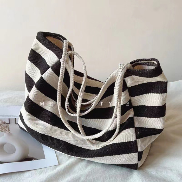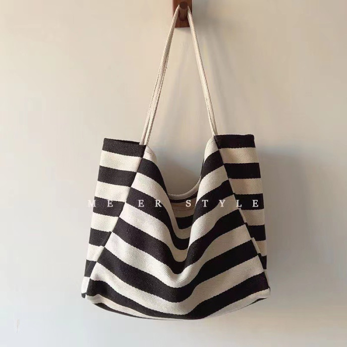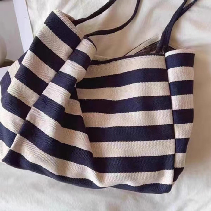 韓國ins文藝撞色條紋帆布包托特大容量單肩慵懶購物袋大包單肩包