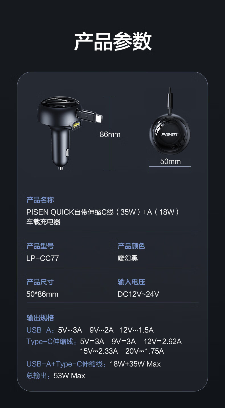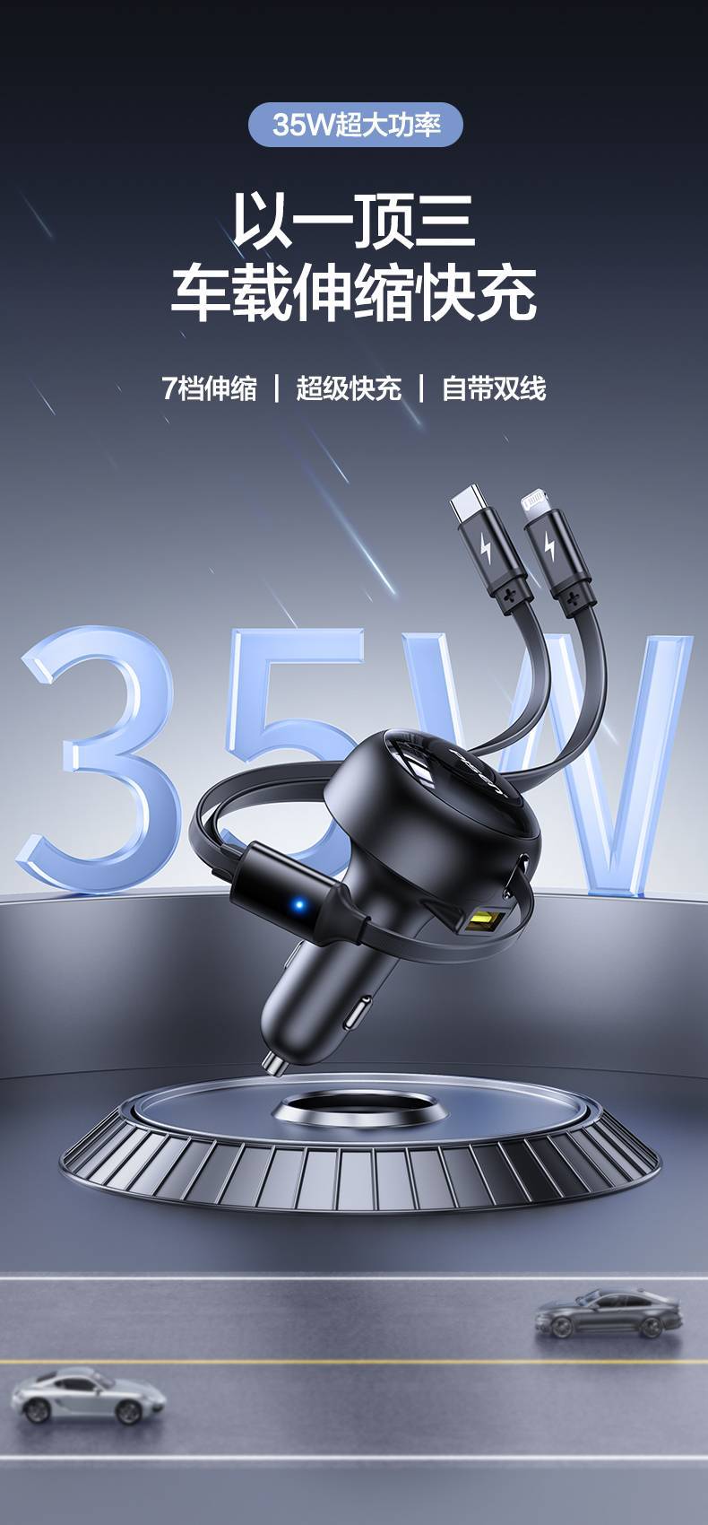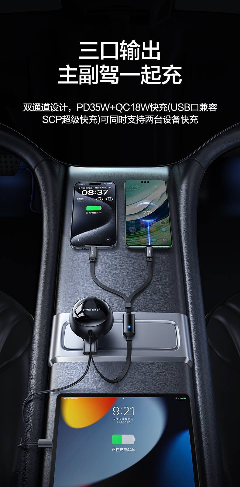 品勝車用充電器伸縮一拖二點菸器快充Type-C車充35W超級快充轉換