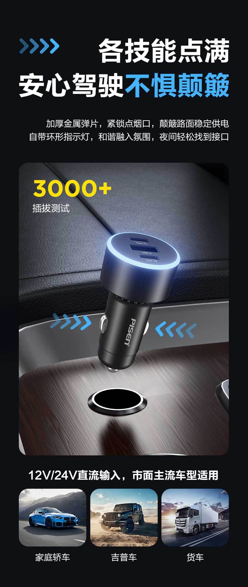 品勝60W多口快充車用充電器USB車用快充一拖二點菸器PD快充蘋果16