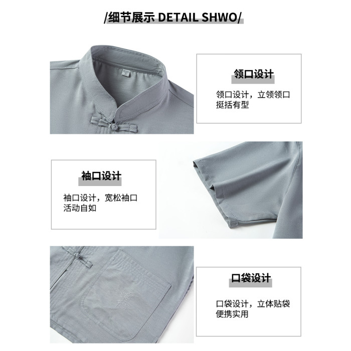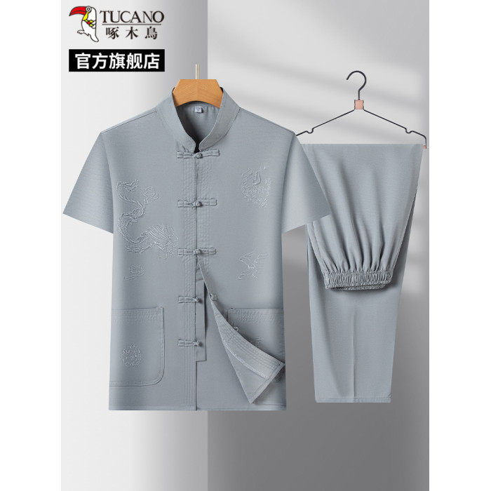 啄木鳥夏季薄款短袖唐裝國風冰絲老人套裝2025新款爸爸中式男裝C