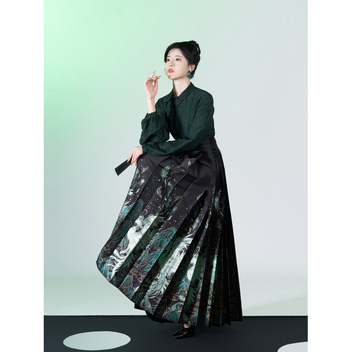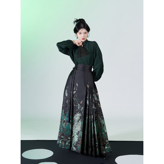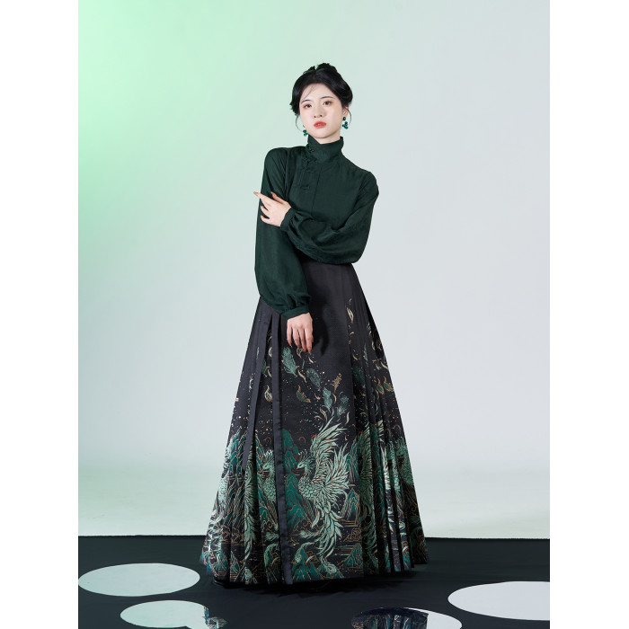 兩件套(羽裳墨綠半高領+青羽馬面裙)