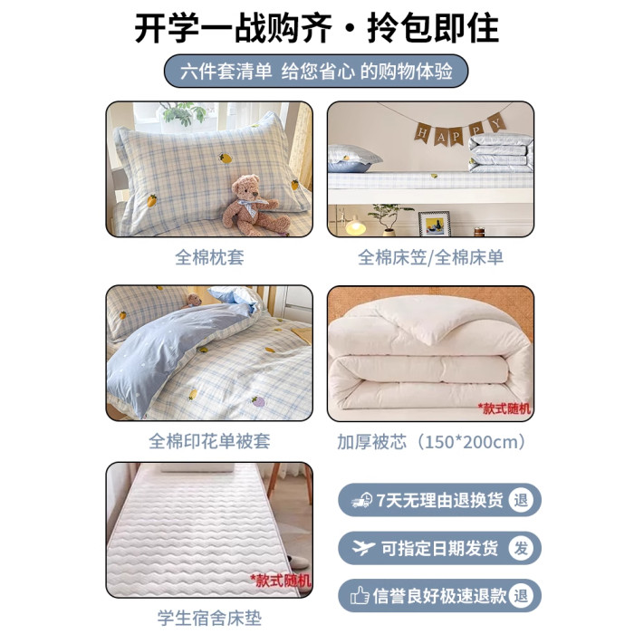 春夏:1.2m學生床笠六件套【三件套+枕芯+約3斤被芯+120x200cm床墊】