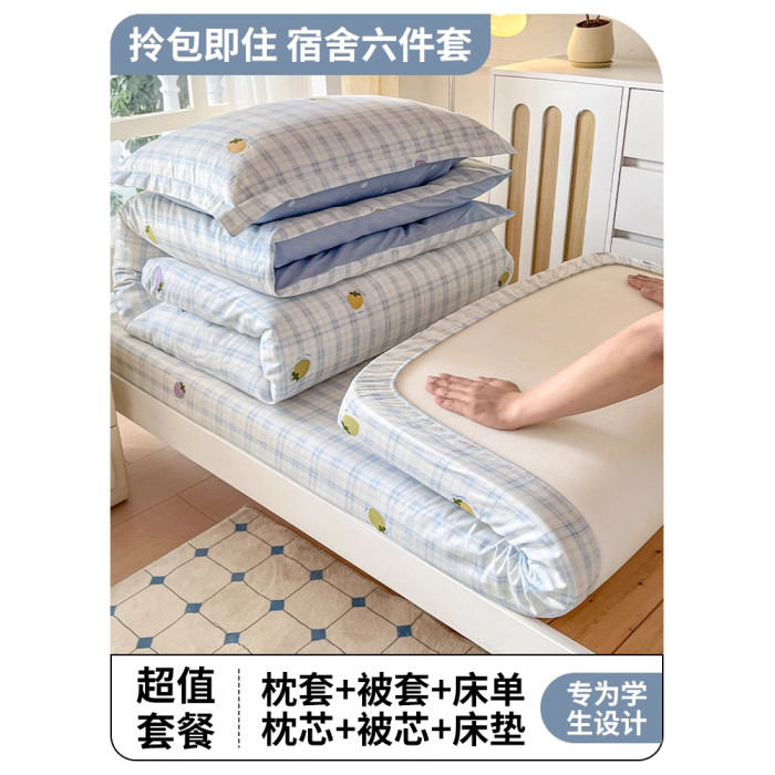 春夏:0.9m學生床笠六件套【三件套+枕芯+約3斤被芯+90x200cm床墊】