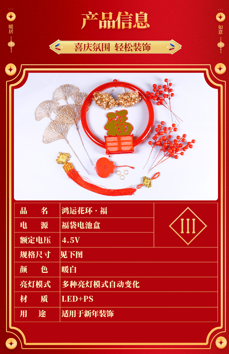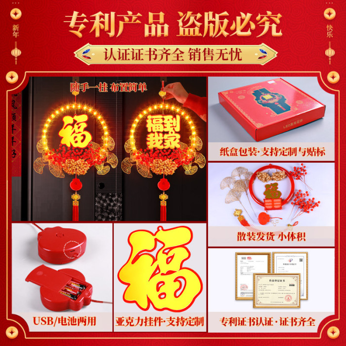 新品發光福字花環掛飾2025蛇年春節日氛圍室內牆貼裝飾布置掛件