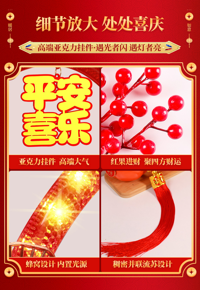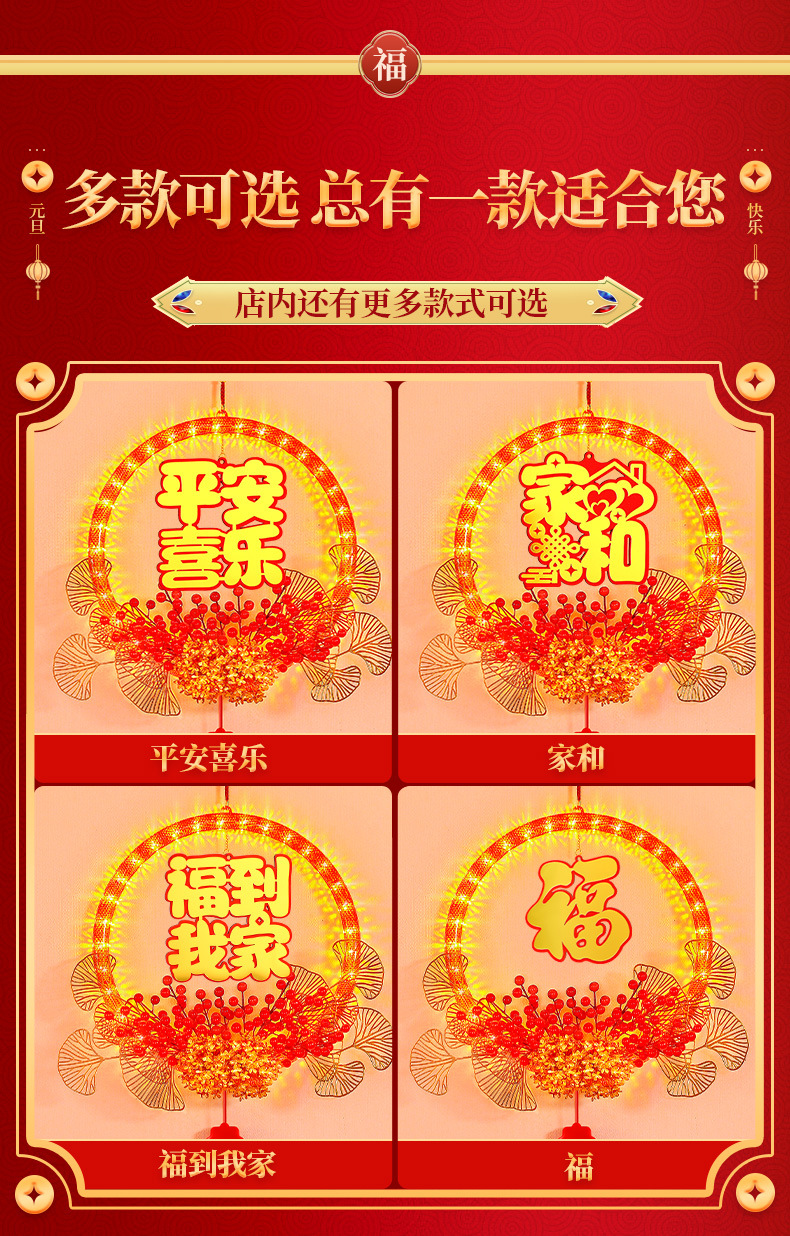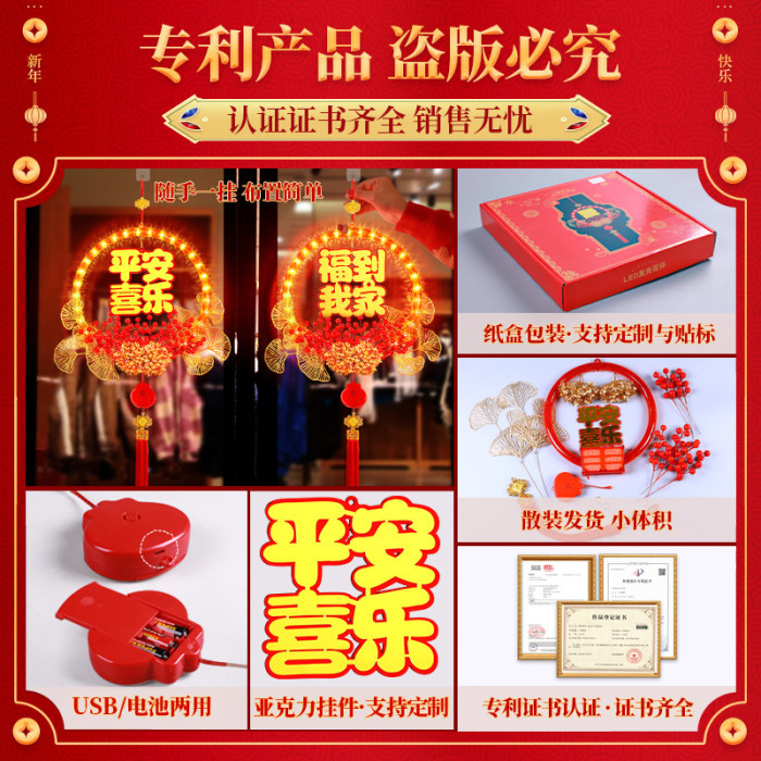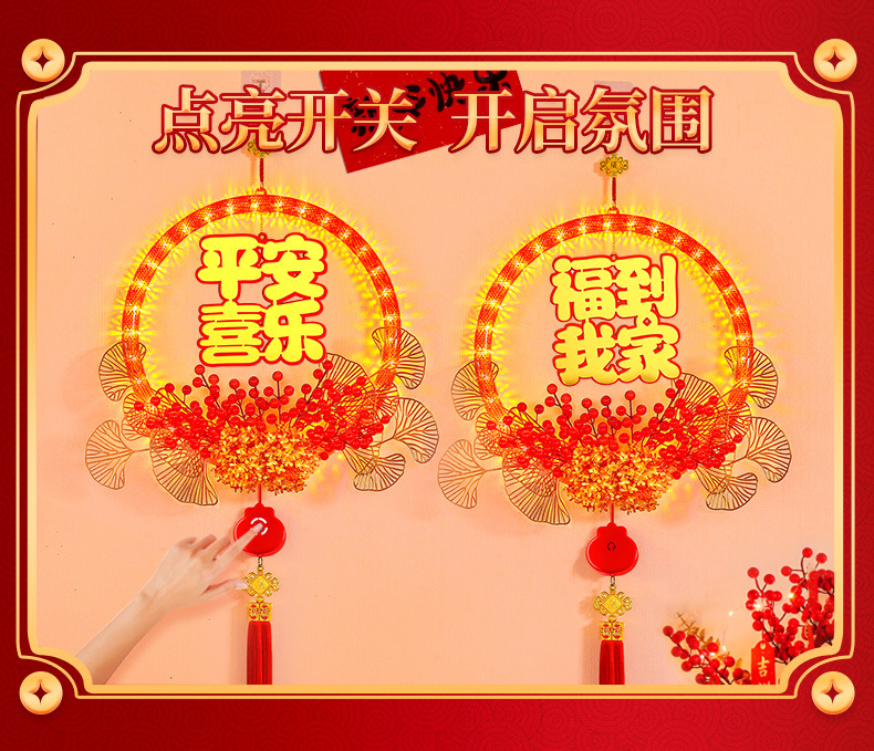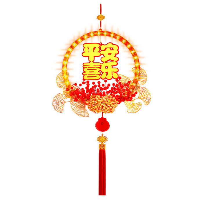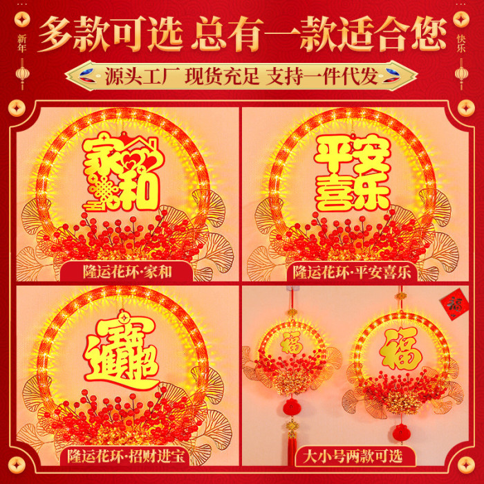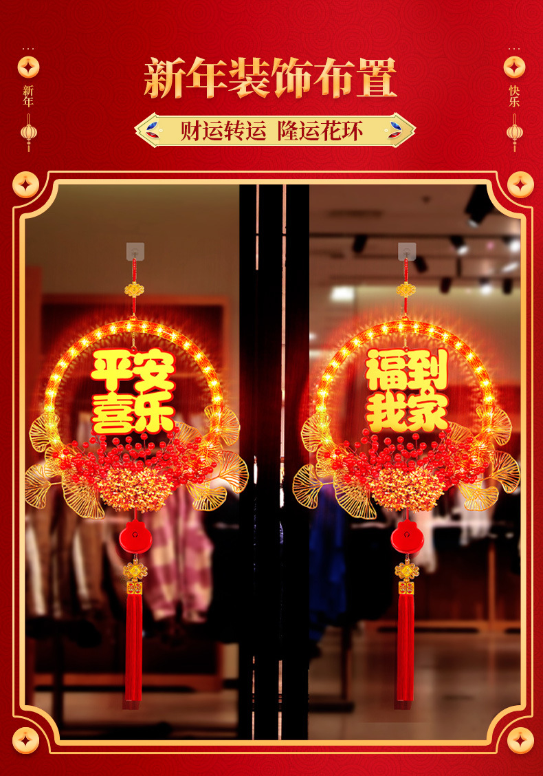 春節發光平安喜樂花環掛件2025蛇年氛圍門店背景裝飾布置掛飾用品