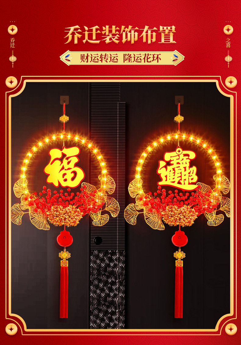 發光招財進寶福字花環喬遷新居搬家入宅儀式掛大門貼布置裝飾用品