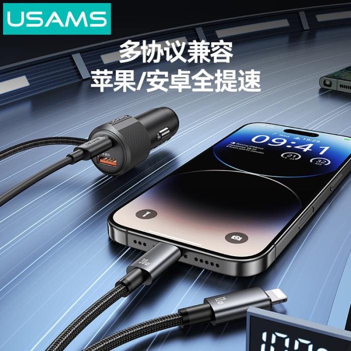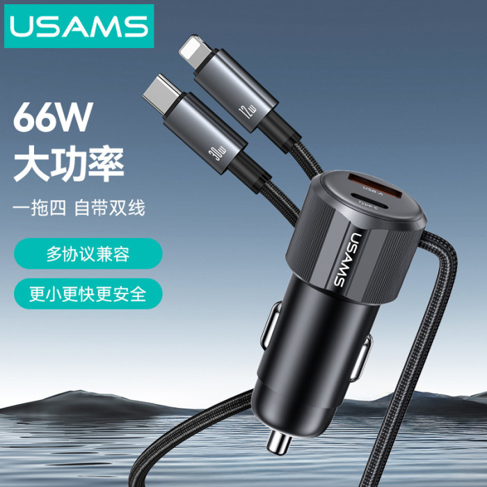 USAMS越途自帶線車用車充點菸器一拖二C+L車用充電器汽車66W