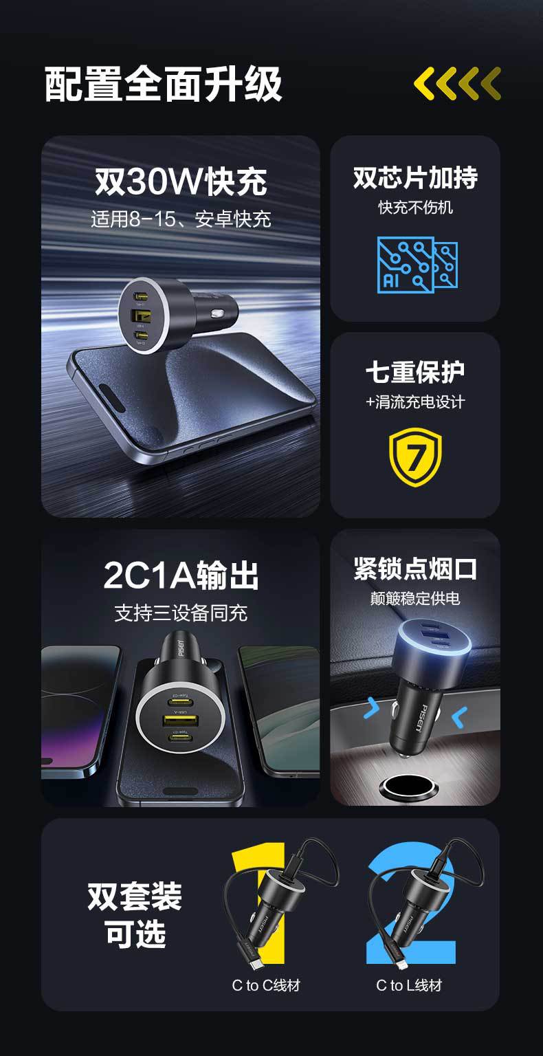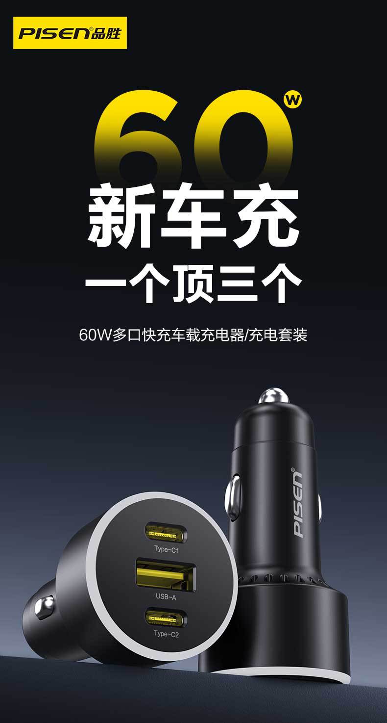 品勝車用充電器60W超級快充適用蘋果16一拖三多口點菸器轉換插頭
