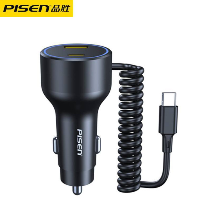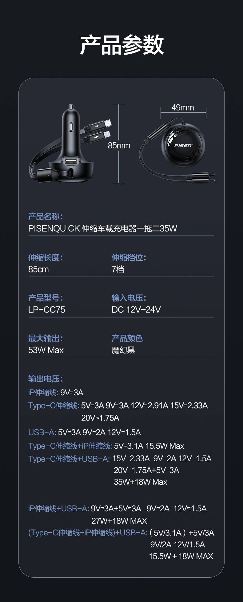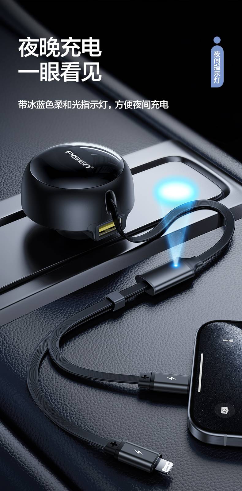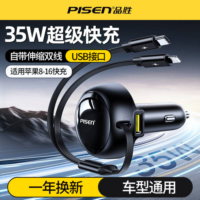 品勝車用充電器自帶PD雙線一拖二車充適用華爲蘋果15點菸器16插頭
