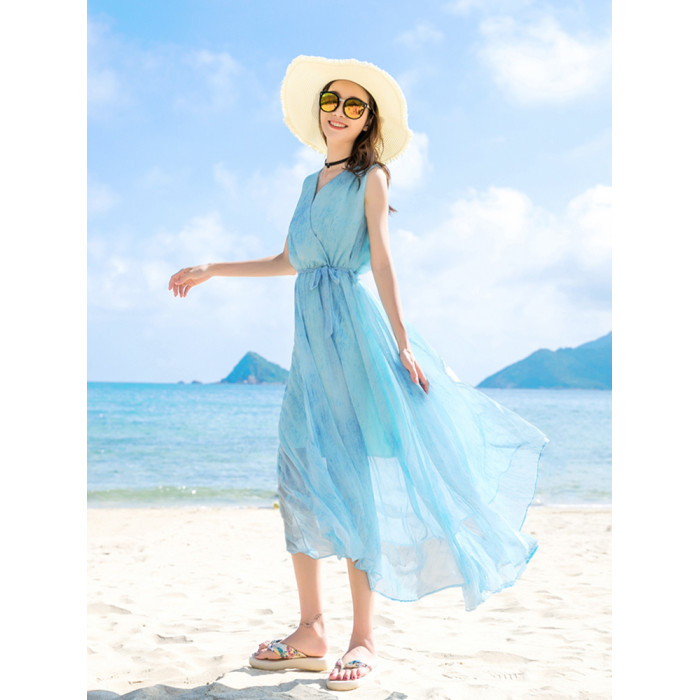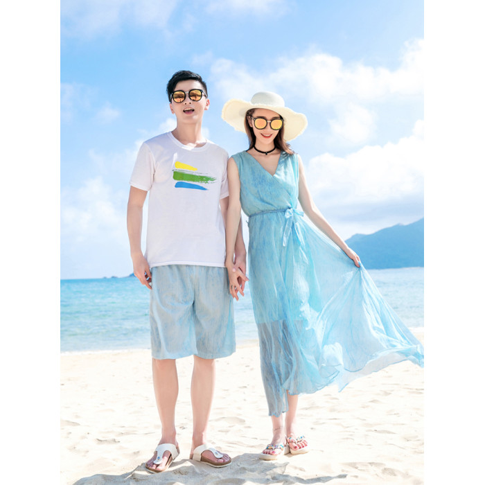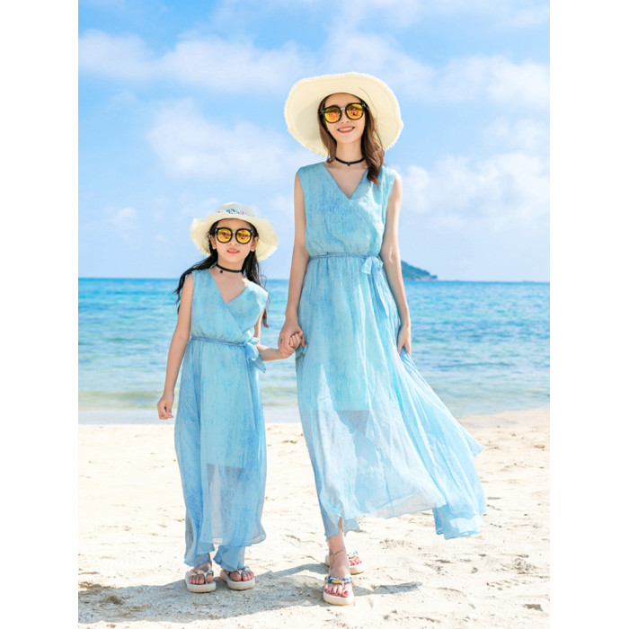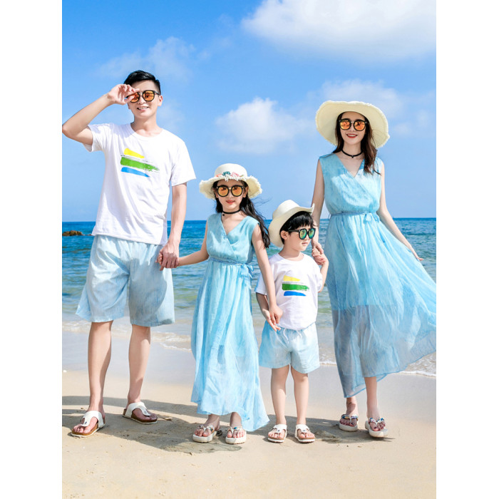 沙灘親子裝一家三四口夏季海邊度假母女裝波西米亞連衣裙父子套裝