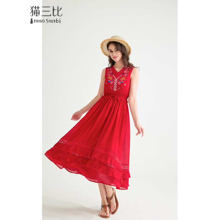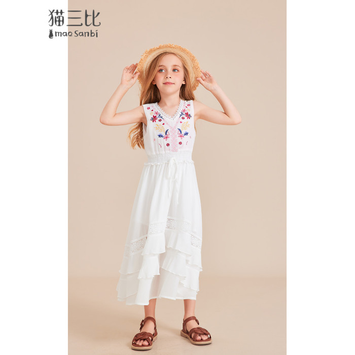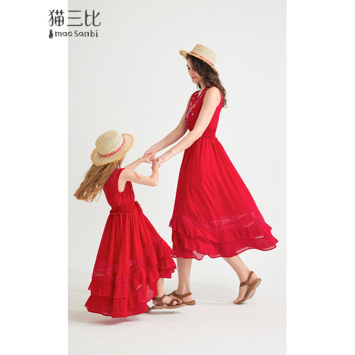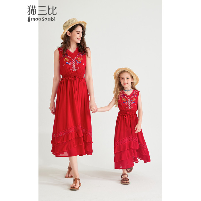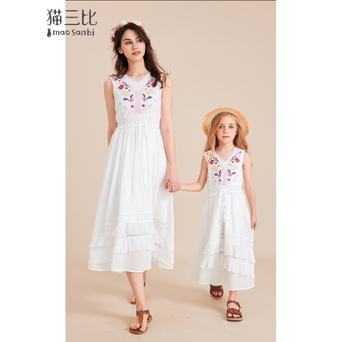 親子裝裙子夏季背心雪紡長裙雲南度假刺綉女童連衣裙母女裝沙灘裙