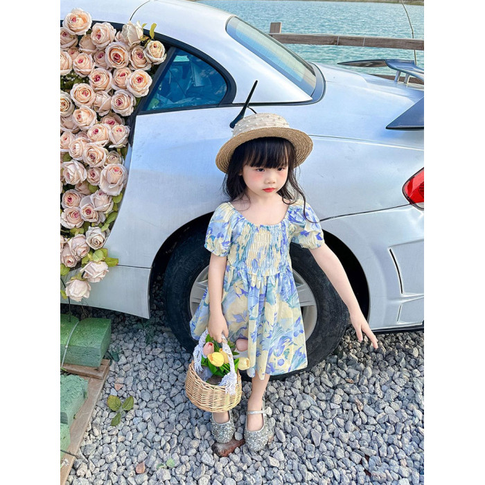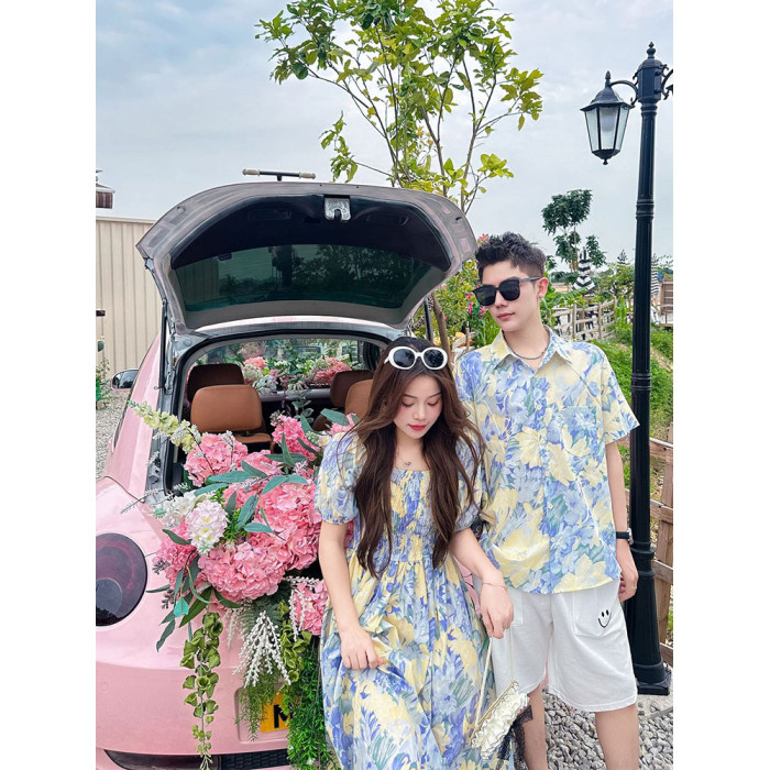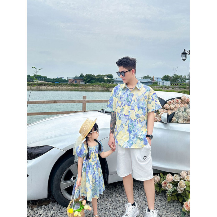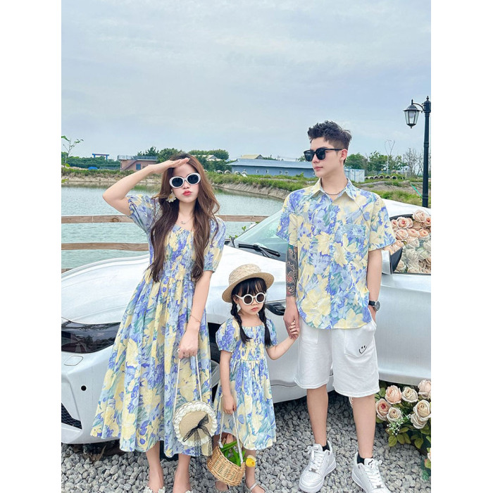 海邊度假母女裝連衣裙2024夏季新款短袖一家三口親子裝襯衫碎花裙