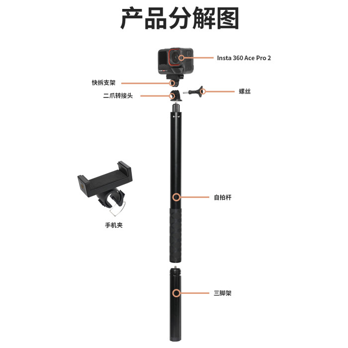 適用影石acepro2自拍桿insta acepro2配件手持桿insta acepro運動相機隱形手持自拍桿延長桿手柄支架三腳架