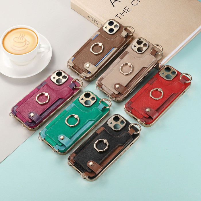 時尚電鍍多功能適用蘋果16手機殼手腕指環配長短皮掛繩iphone皮套