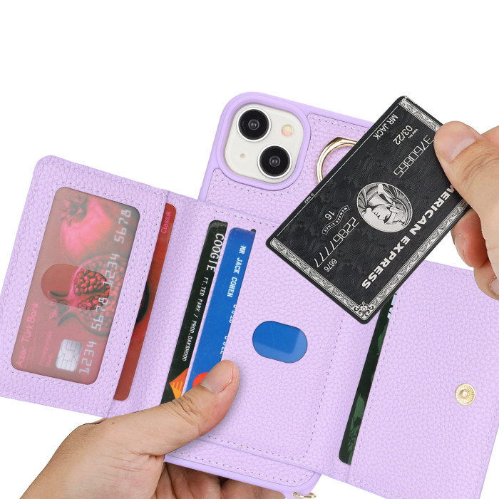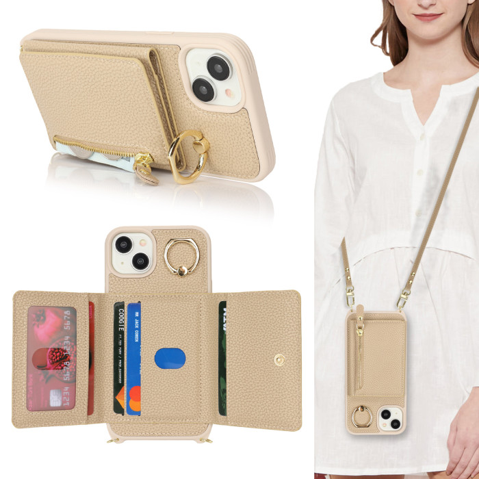 適用蘋果15promax手機殼荔枝紋指環斜背iphone14錢包式保護套插卡