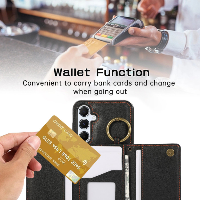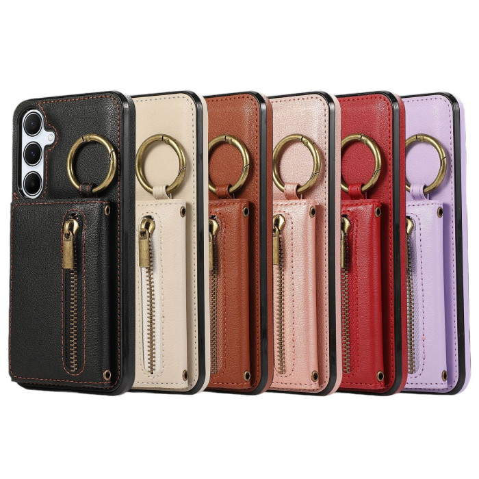 適用三星A55斜背插卡皮套A35三折指環扣A15拉鍊卡包A25支架手機殼