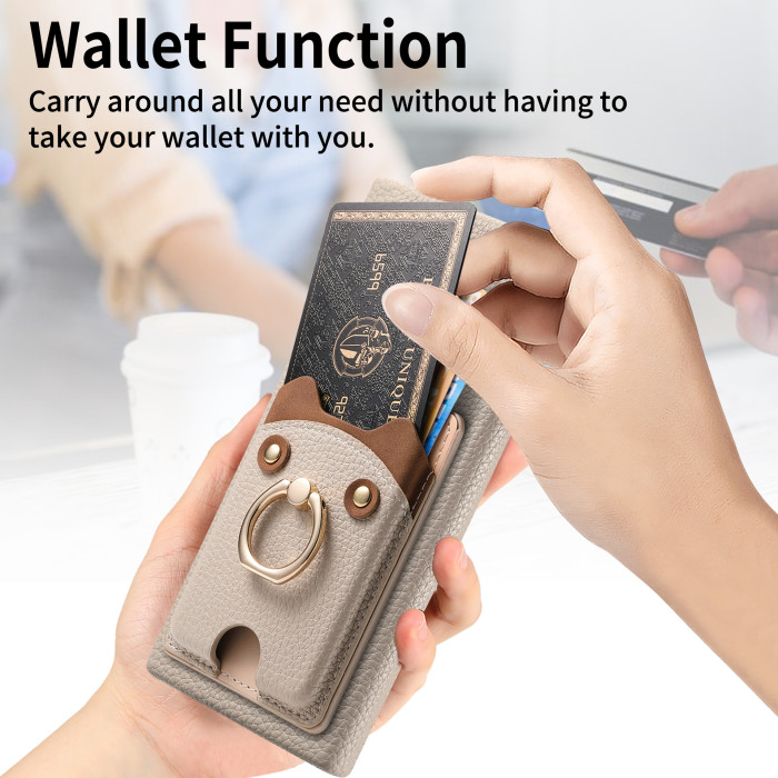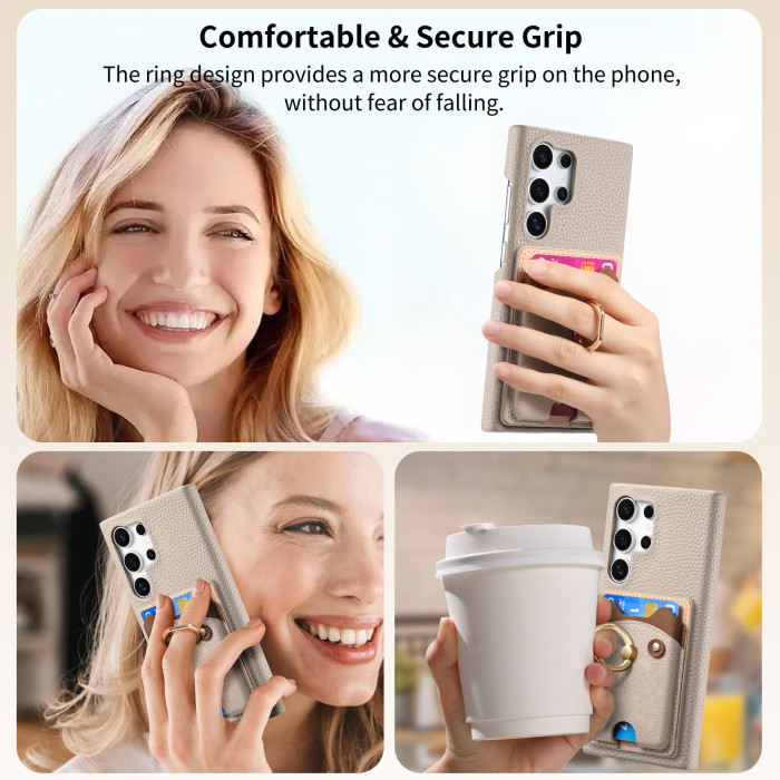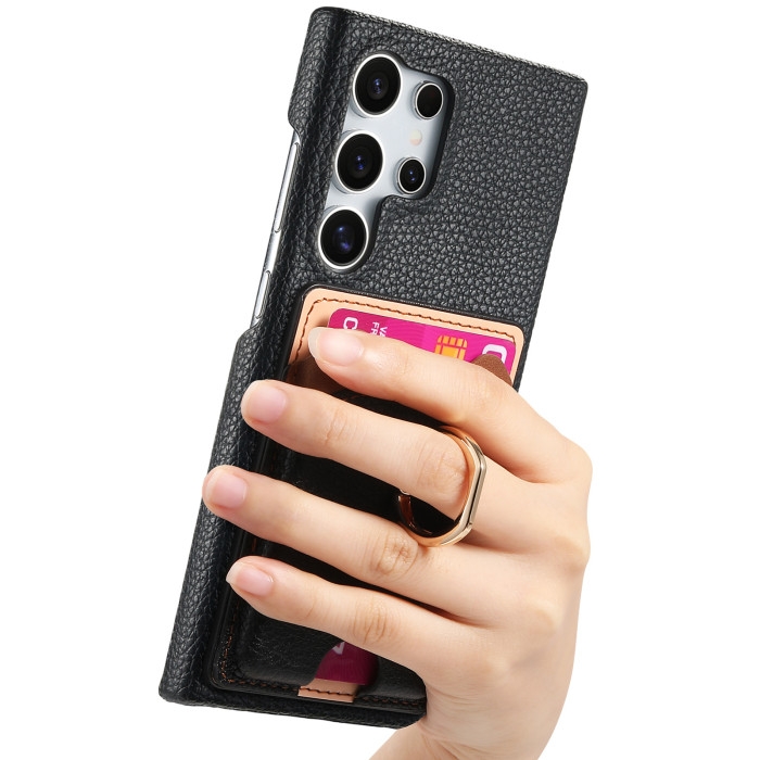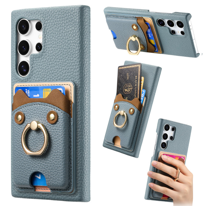 適用三星S25Ultra荔枝紋素皮手機殼A16可愛小熊支架A56插卡保護套