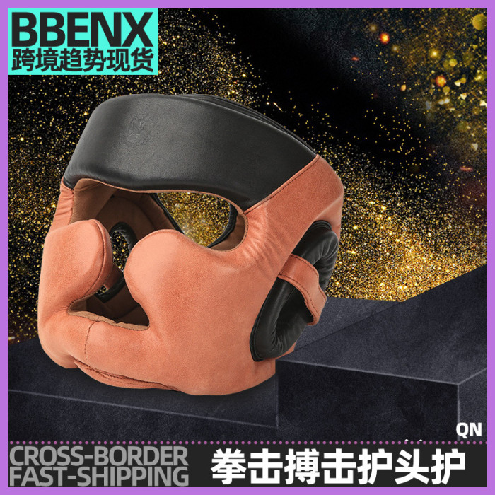 拳擊護頭護具牛皮手工印染復古護頭比賽頭部防護套猴臉散打護頭盔