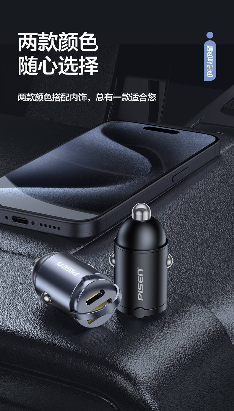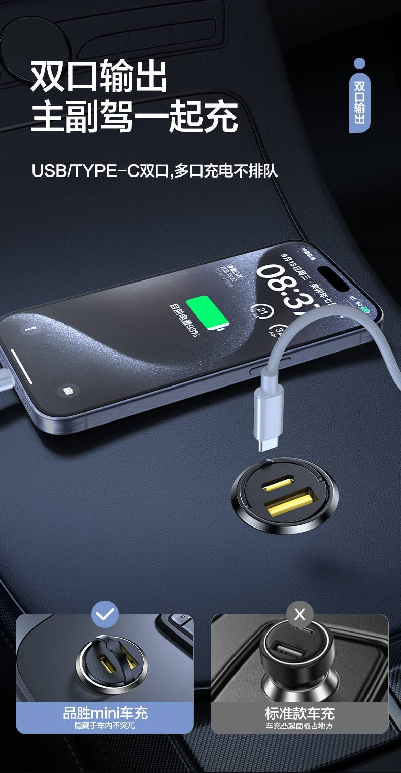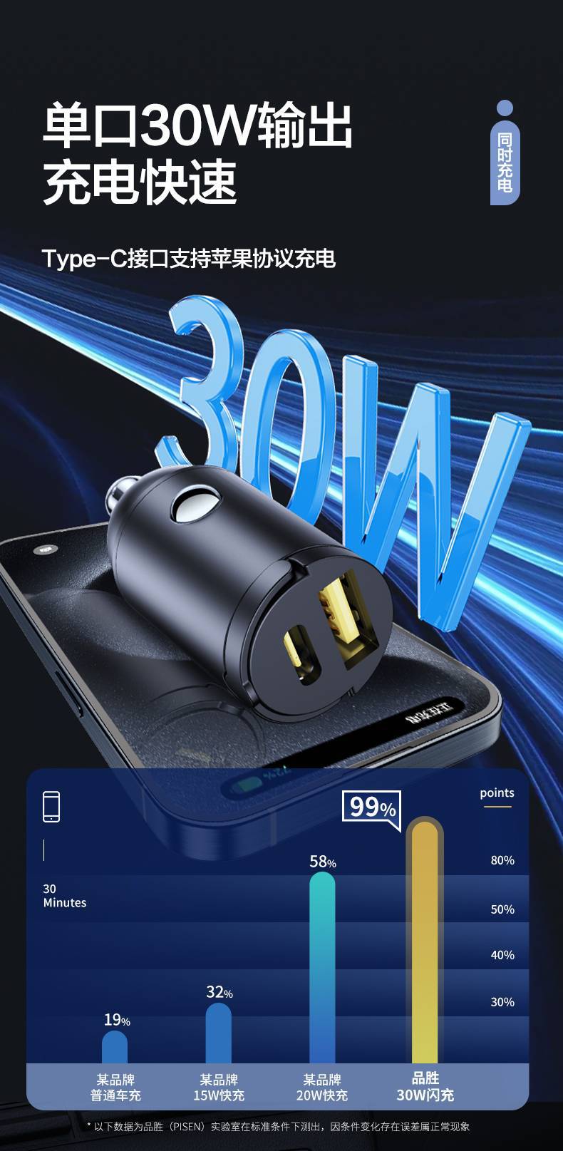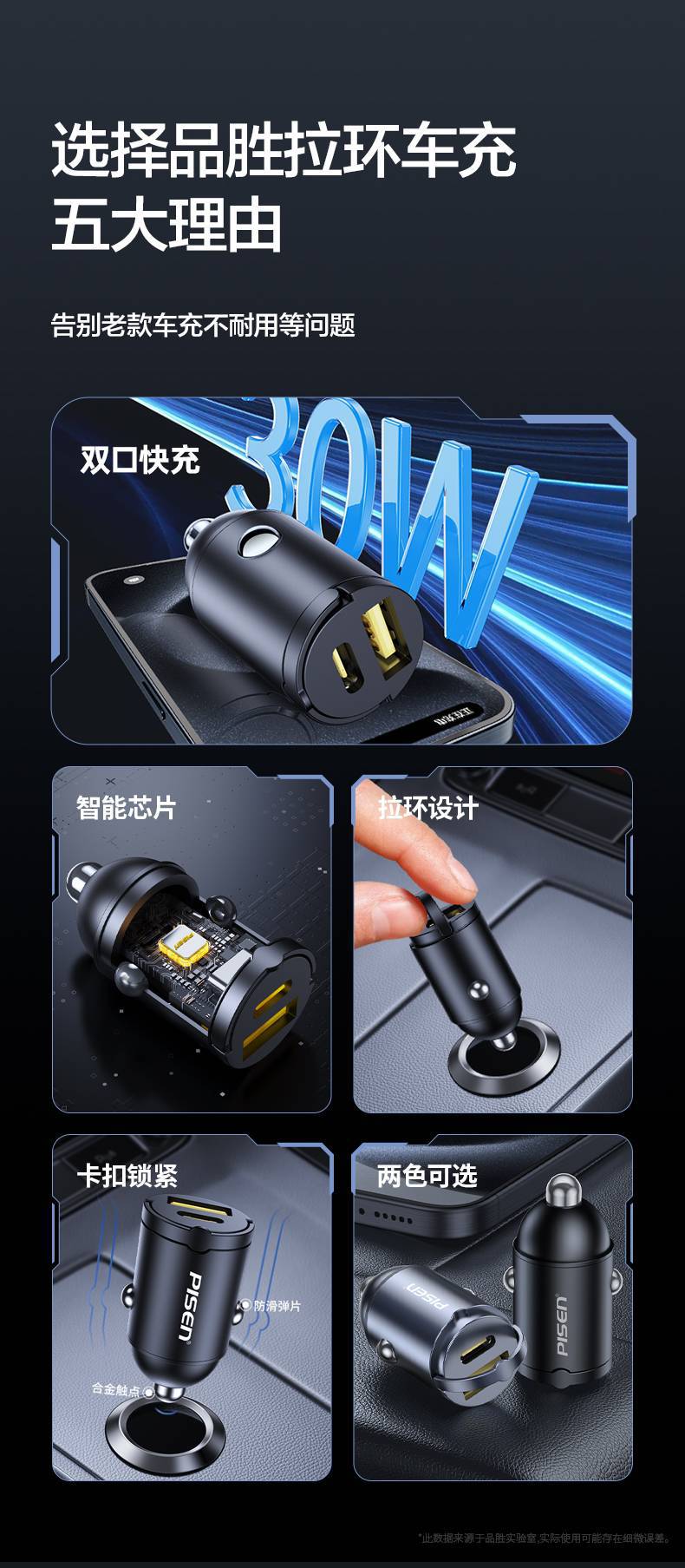 品勝車充30W拉環車用充電器PD快充適用華爲蘋果小米vivo雙口閃充