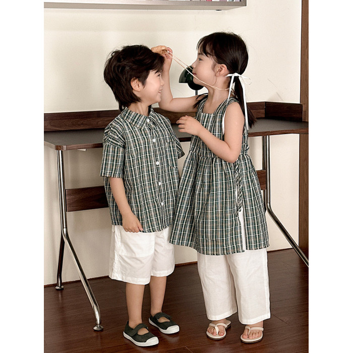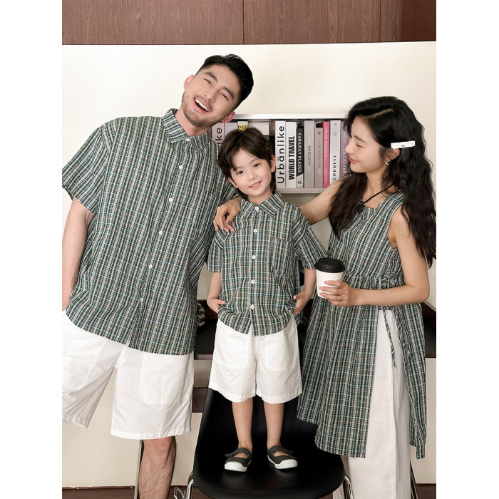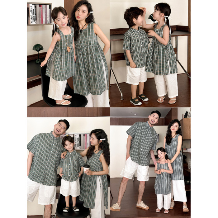 森系親子裝2025夏季母子母女套裝女童格子兩件套一家三四口家庭裝