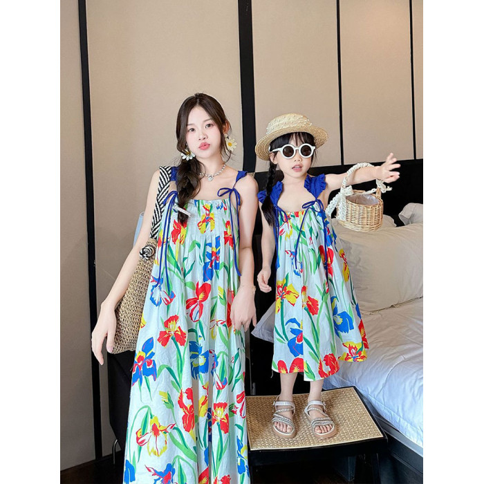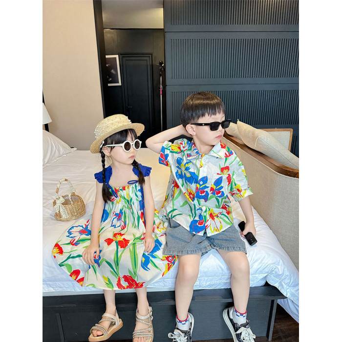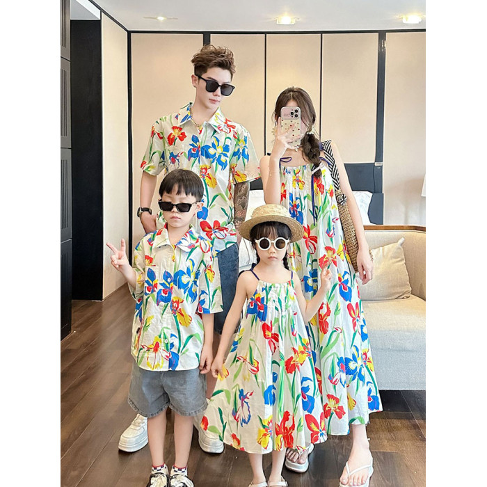 2024新款親子裝夏季海邊度假花襯衫一家三口沙灘裝母女吊帶連衣裙